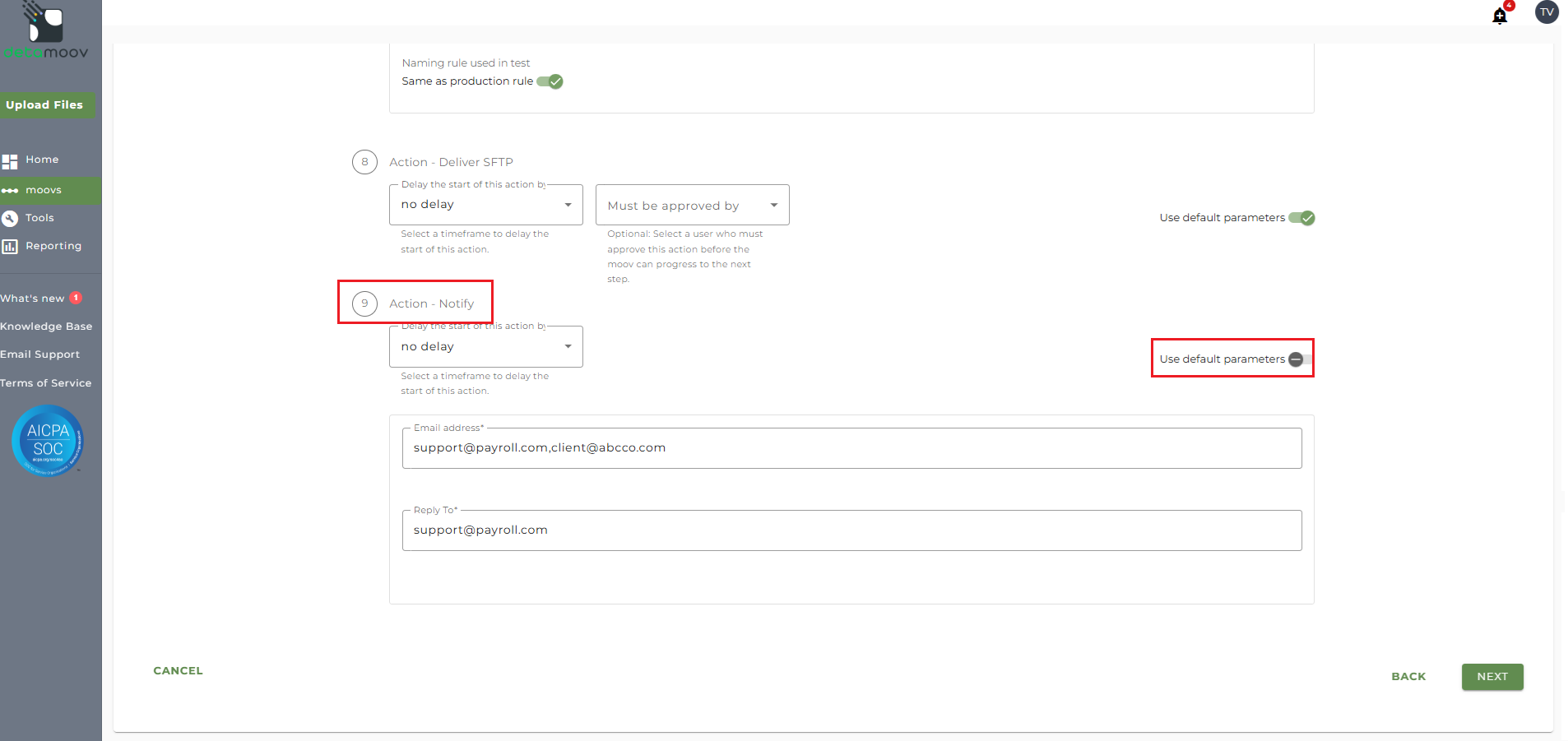 Note: these settings apply to any client configuration you set up for this specific moov. You also have the ability to configure the notification step for each client configuration if you wish to add or remove email addresses per client.