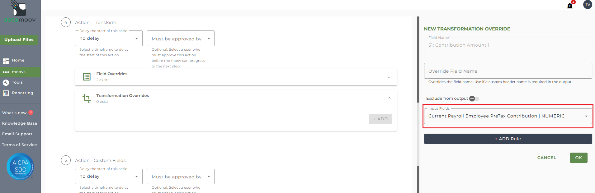 For each contribution on your client's plan, you must create a transformation override to map the appropriate field in the Standard 401k. To add a transformation override, locate the Action - Transform step, expand the Transformation Overrides panel and click the Add button.