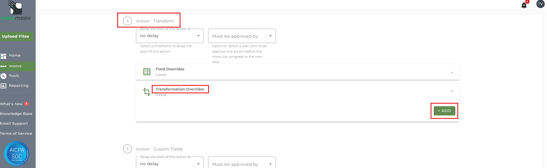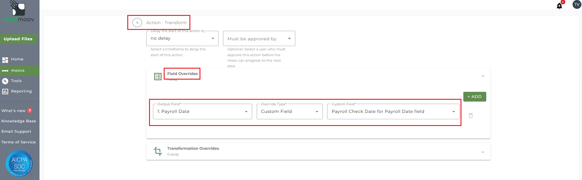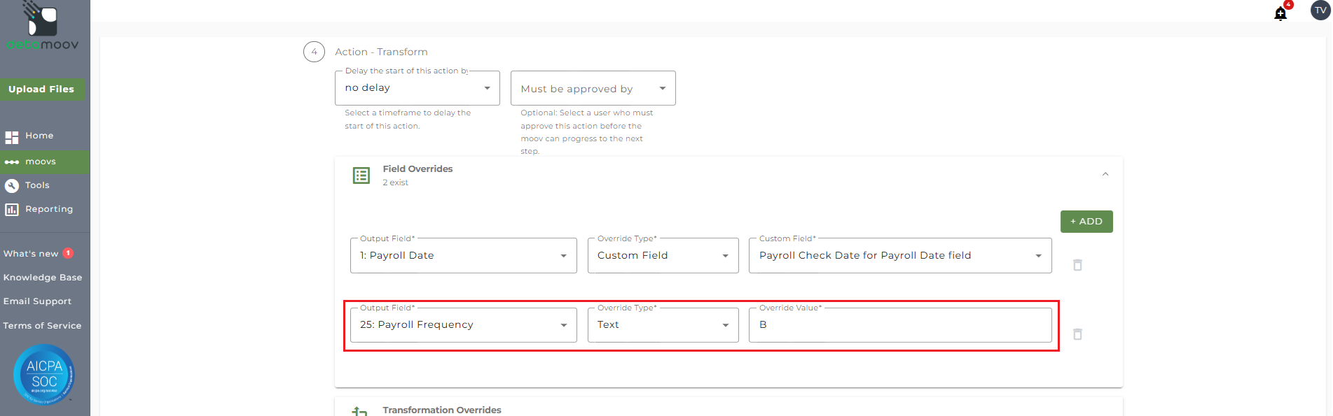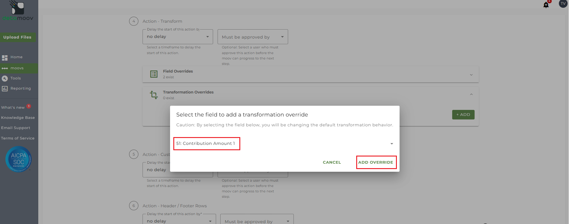 To provide the override custom fields, locate the Action - Transform step, click the Field Overrides panel, and click the Add button. Then select the appropriate field from the Output Field dropdown, change the Override Type to Custom Field, and then select the Custom field from the dropdown menu as shown below:
