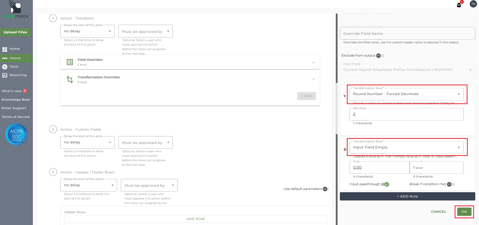 Next, click the ADD RULE button and select the Round Number - Forced Decimals rule and enter a 2 into the Decimals field. Then click the ADD RULE button again and select Input Field Empty. In the True field, enter in 0.00 and toggle the Input Passthrough switch ON. Then click OK.