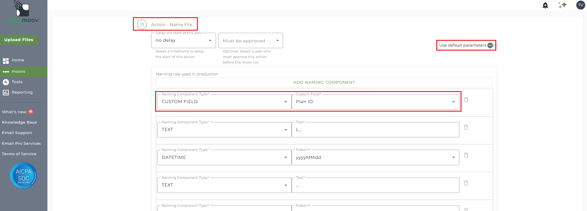 To add a file name override, locate step 13: Action - Name File and toggle the 'Use default parameters' off. Then change the Naming Component Type Custom Field of Plan ID to Text and enter in the Plan ID.