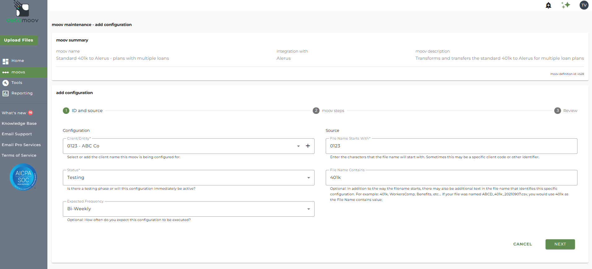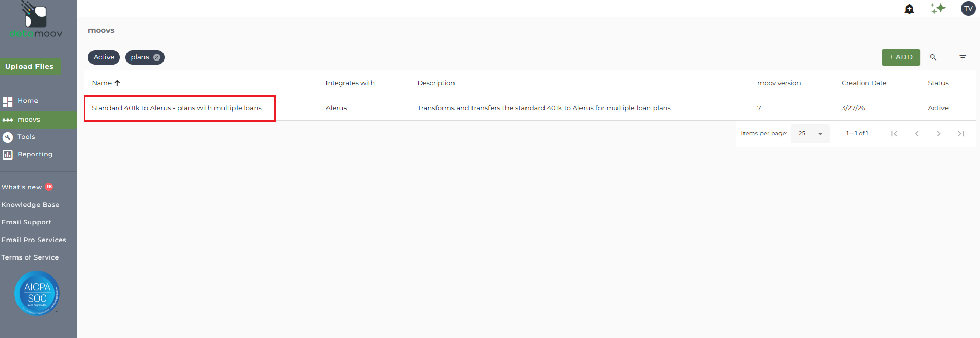 Once the Standard 401k to Alerus - plans with multiple loans moov has been added to your account, access the moovs section on the left side menu and click on the Standard 401k to Alerus - plans with multiple loans moov.