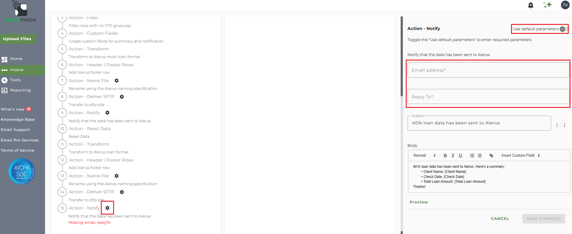 To edit the notification step for loan data, click on the cog icon under step 15: Action - Notify on the left. Then toggle the "Use default parameters" off and enter in the email addresses you would like to receive the notification. If you would like to enter multiple email addresses, separate them with a comma. A Reply to email is also required in the event that a recipient of the notification replies to the email.