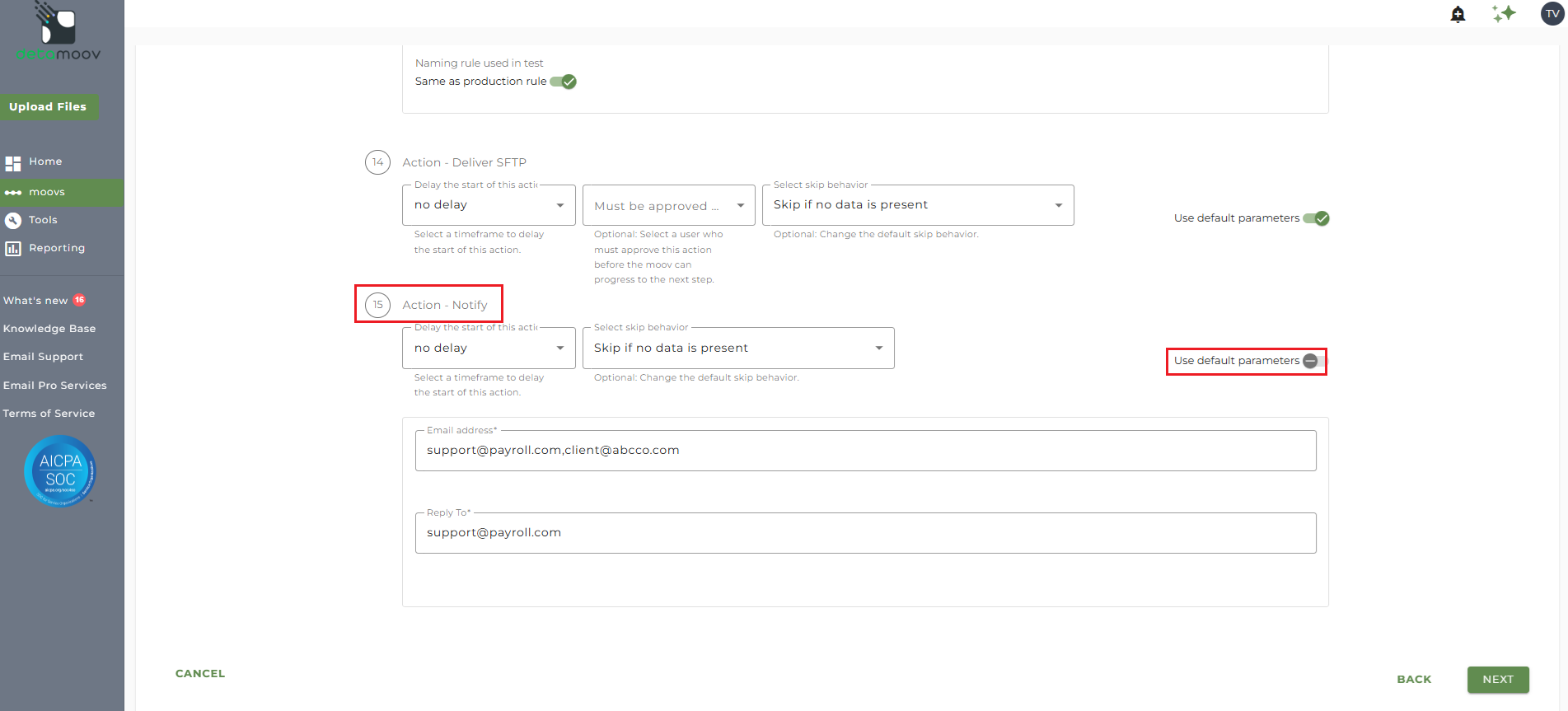 At the beginning of this article you configured the notification step for the moov to send a notification once contribution data has been sent to Alerus. You also have the ability to configure the notification step for each client configuration if you wish to add or remove email addresses per client.