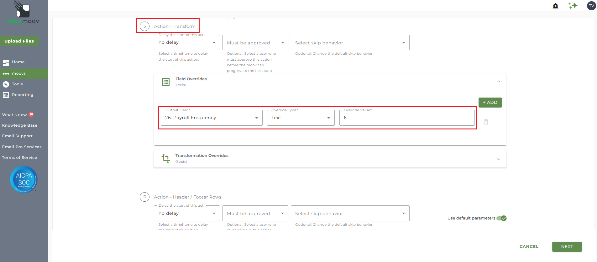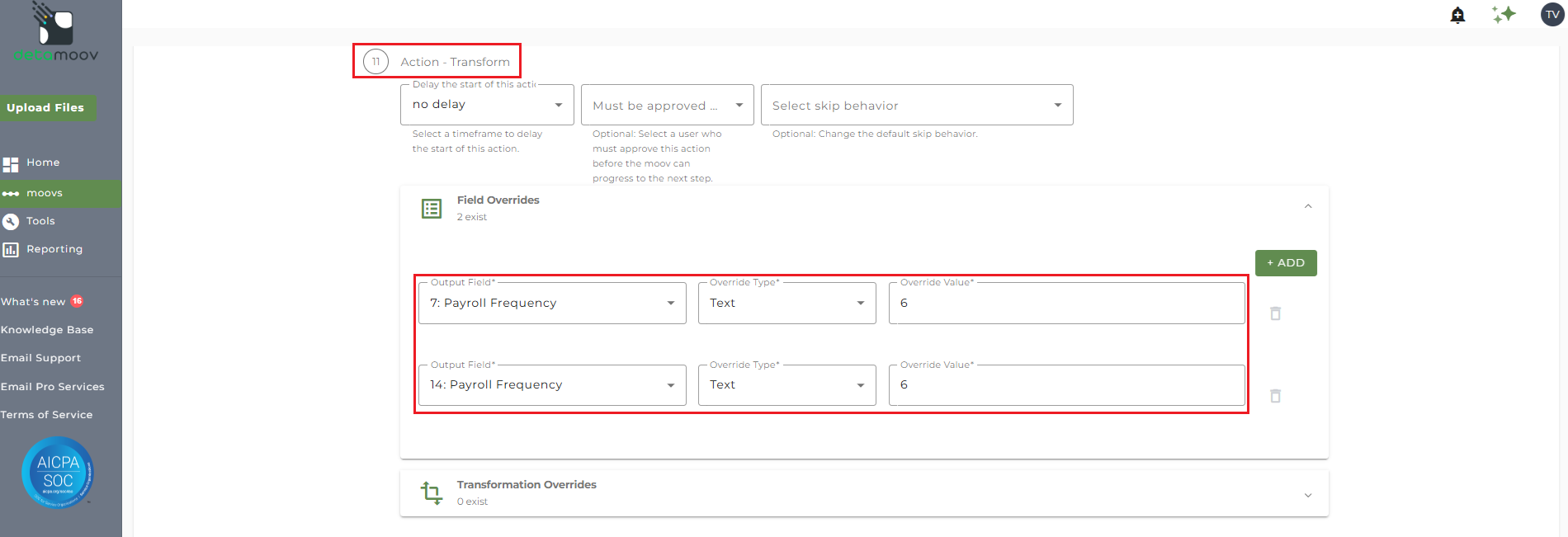 To add a field override for the Payroll Frequency field, locate step 5: Action - Transform and click the Field Overrides panel. Then click the Add button and select '26: Payroll Frequency' from the Output field dropdown menu.