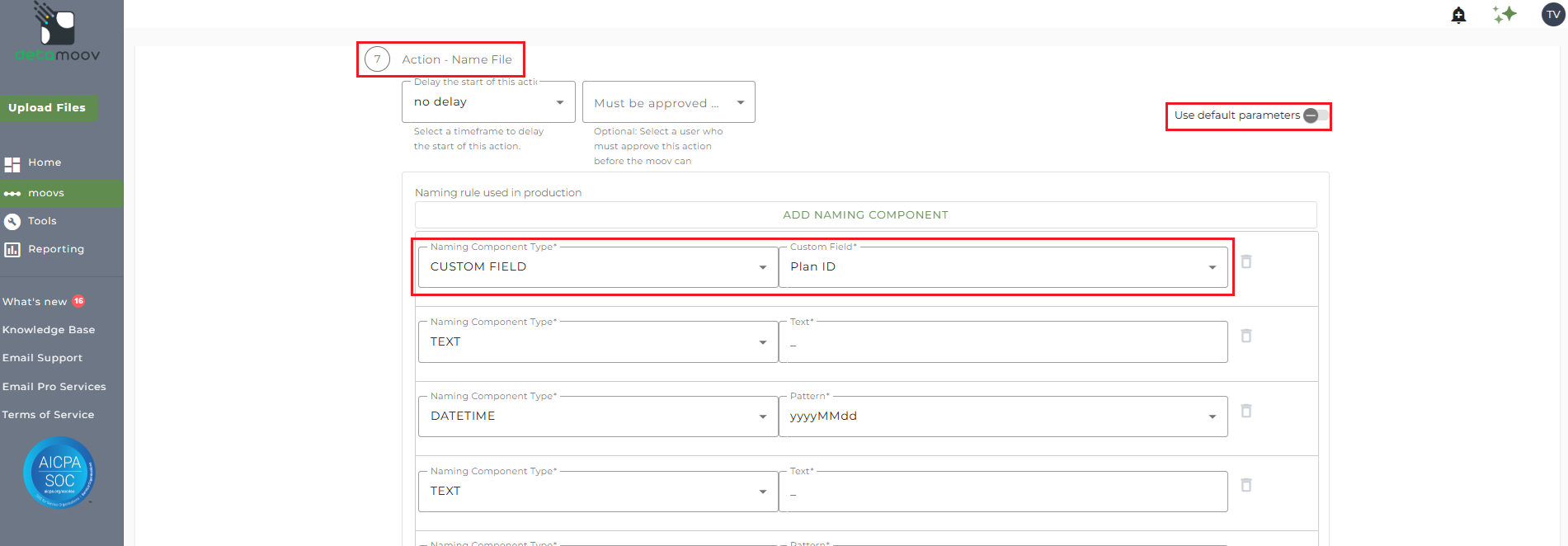 To add a file name override, locate step 7: Action - Name File and toggle the 'Use default parameters' off. Then change the Naming Component Type Custom Field of Plan ID to Text and enter in the Plan ID.