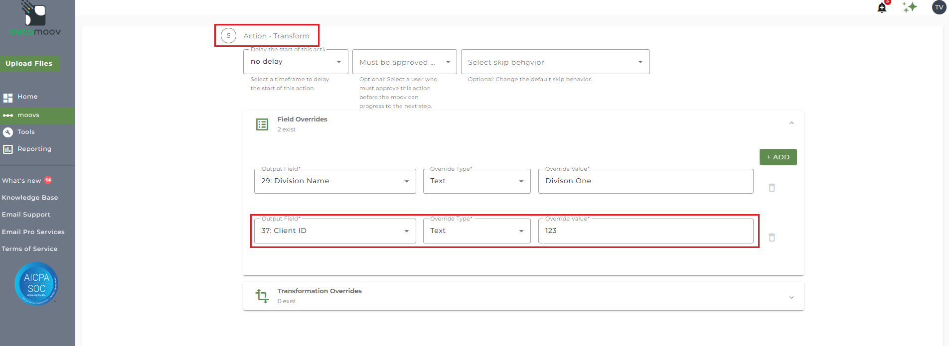To add a Field Override, locate the Action - Transform step, expand the Field Overrides panel and click the Add button. Then select the appropriate Output field, set the Override Type to Text and enter the Override Value.