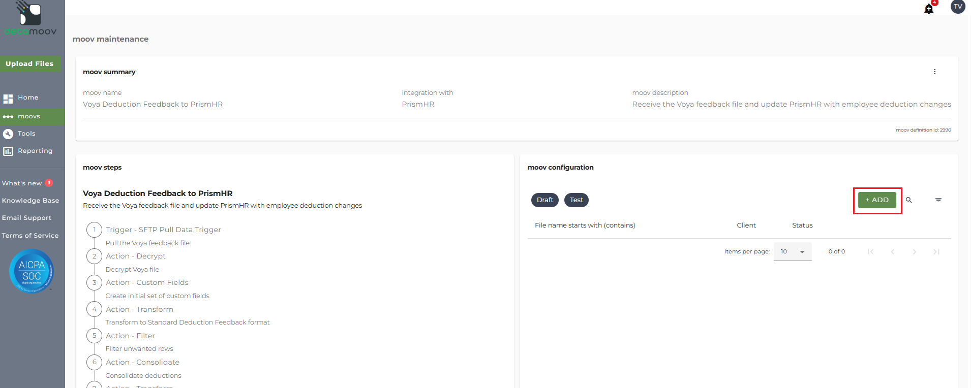 After the PrismHR Premier Integration has been activated on your account and the SFTP account has been created, please add the Voya Deduction Feedback to PrismHR moov to your account by following these steps.