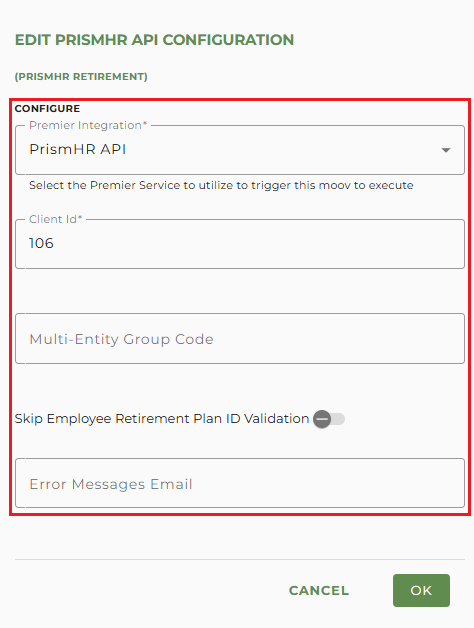 Click OK to complete the PrismHR Retirement 360 configuration.