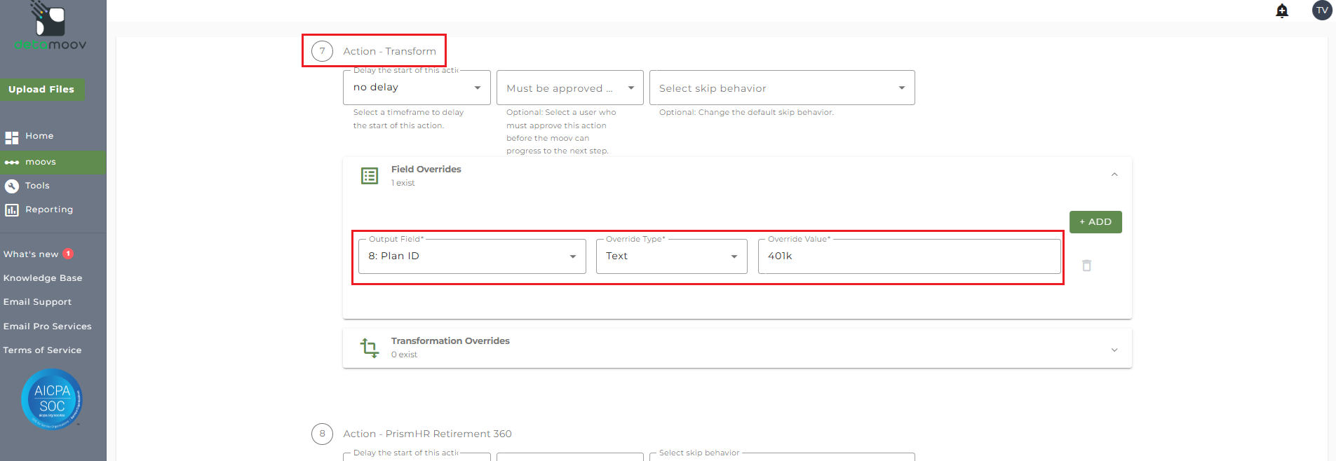 NOTE: There are 3 separate Transform steps on the Voya Deduction Feedback to PrismHR moov. Make sure are you creating the field override on step 7 - Action Transform.