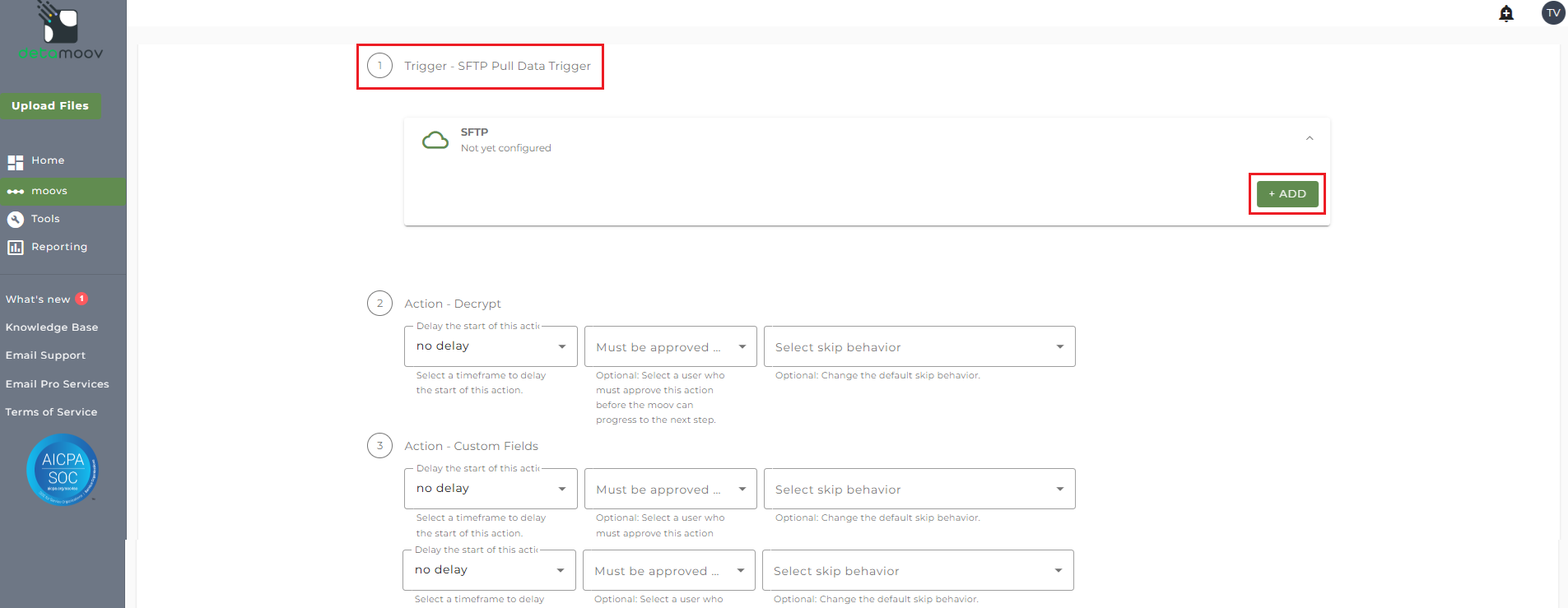To automate the 360 integration, configure the SFTP schedule. Click the SFTP banner under the Trigger - SFTP Pull Data Trigger step and click Add.
