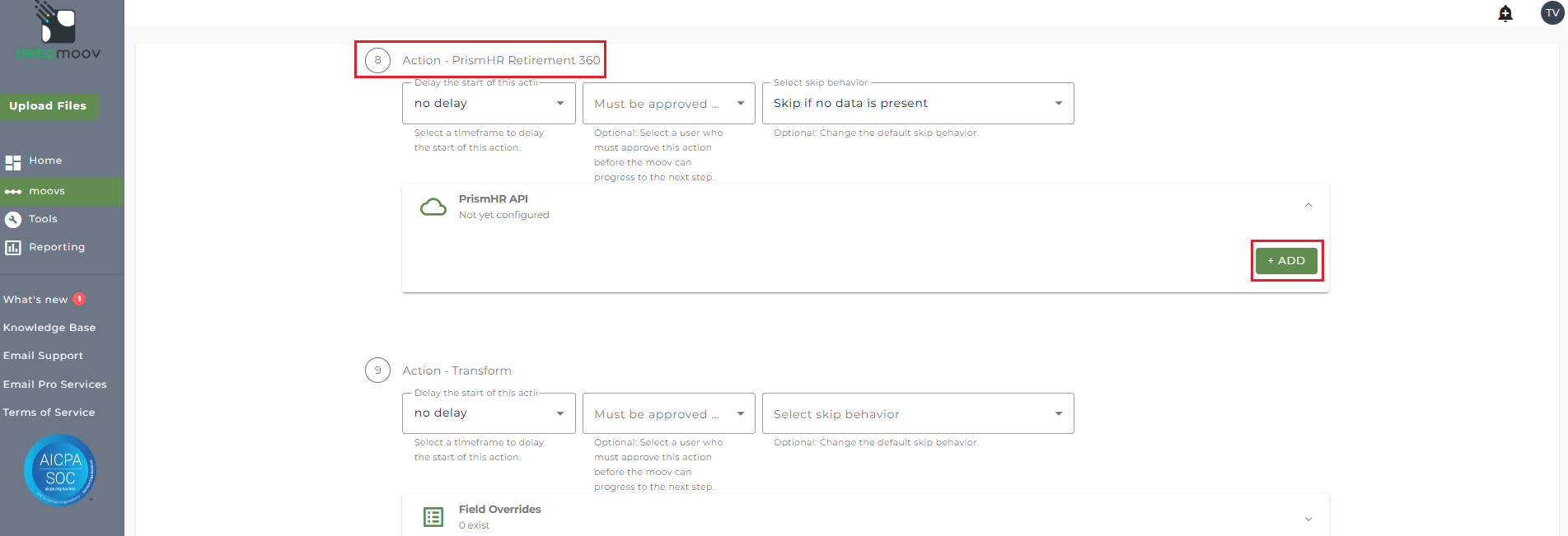 To configure the PrismHR Retirement 360 step for you client, locate the Action - PrismHR Retirement 360 step, expand the PrismHR API panel and click ADD.