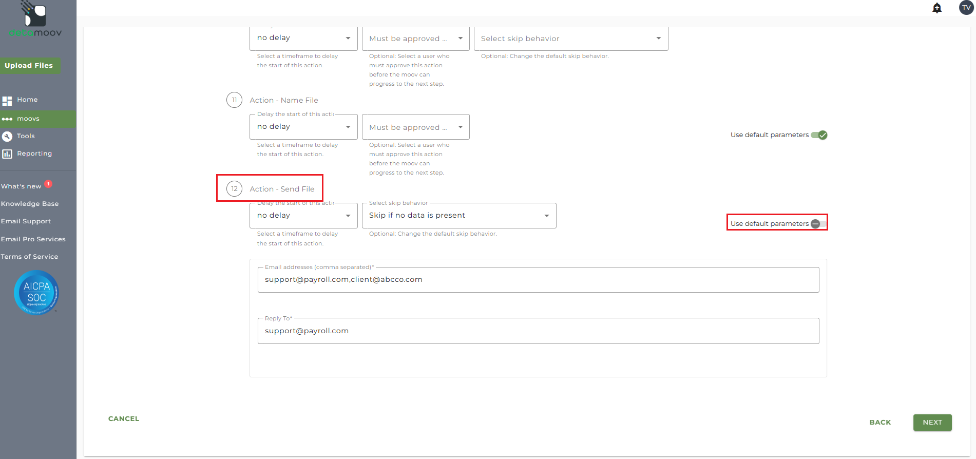 Note: these settings apply to any client configuration you set up for this specific moov. You also have the ability to configure the send file step for each client configuration if you wish to add or remove email addresses per client.