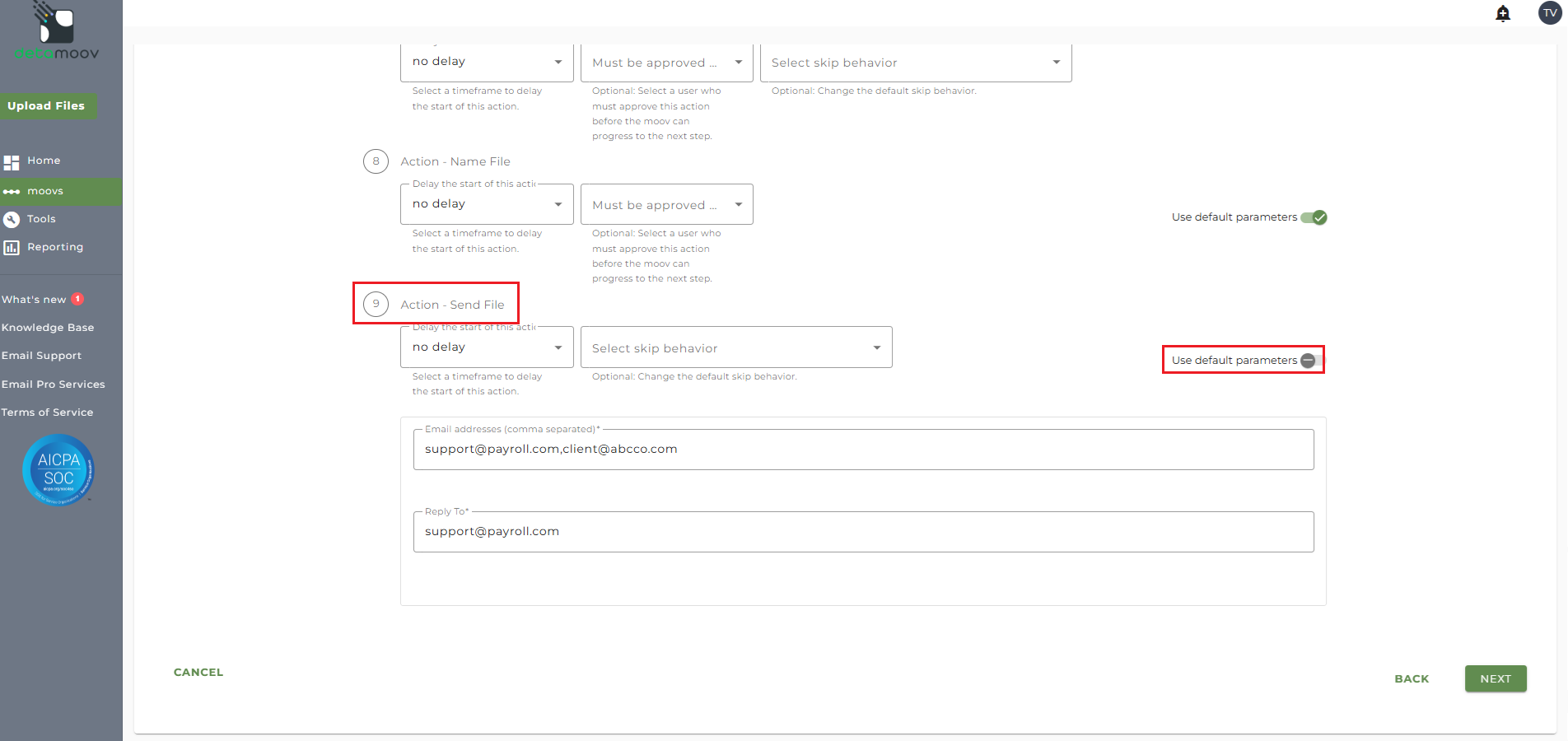 Note: these settings apply to any client configuration you set up for this specific moov. You also have the ability to configure the send file step for each client configuration if you wish to add or remove email addresses per client.