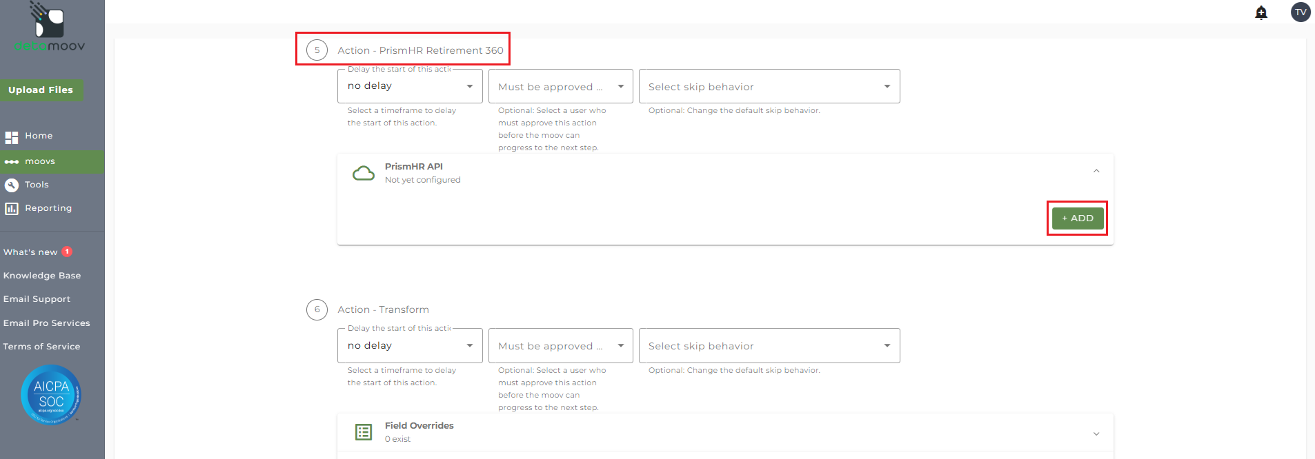 To configure the PrismHR Retirement 360 step for you client, locate the Action - PrismHR Retirement 360 step, expand the PrismHR API panel and click ADD.