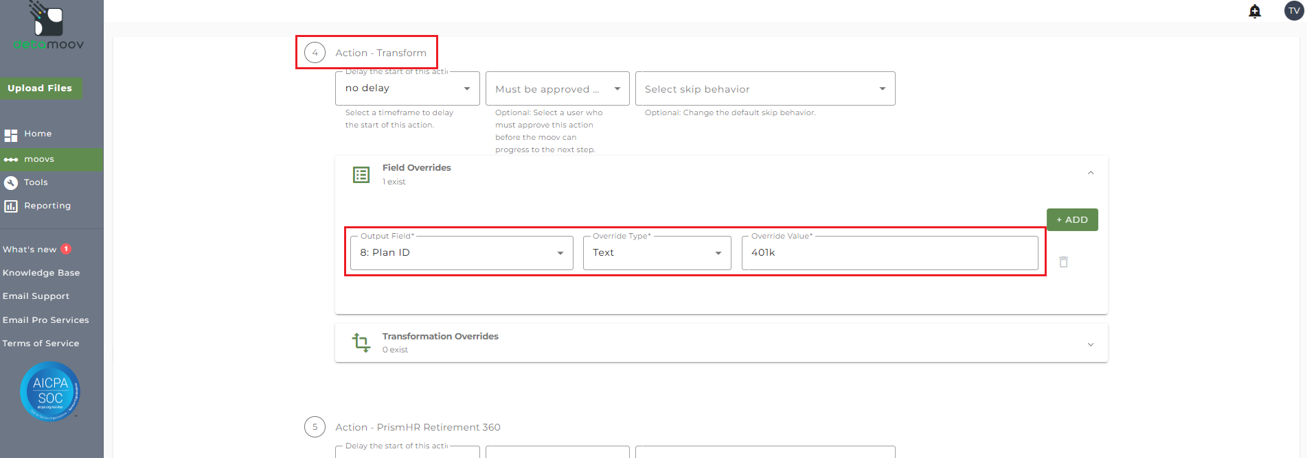 NOTE: There are 3 separate Transform steps on the Ascensus Deduction Feedback to PrismHR moov. Make sure are you creating the field override on step 4- Action Transform.