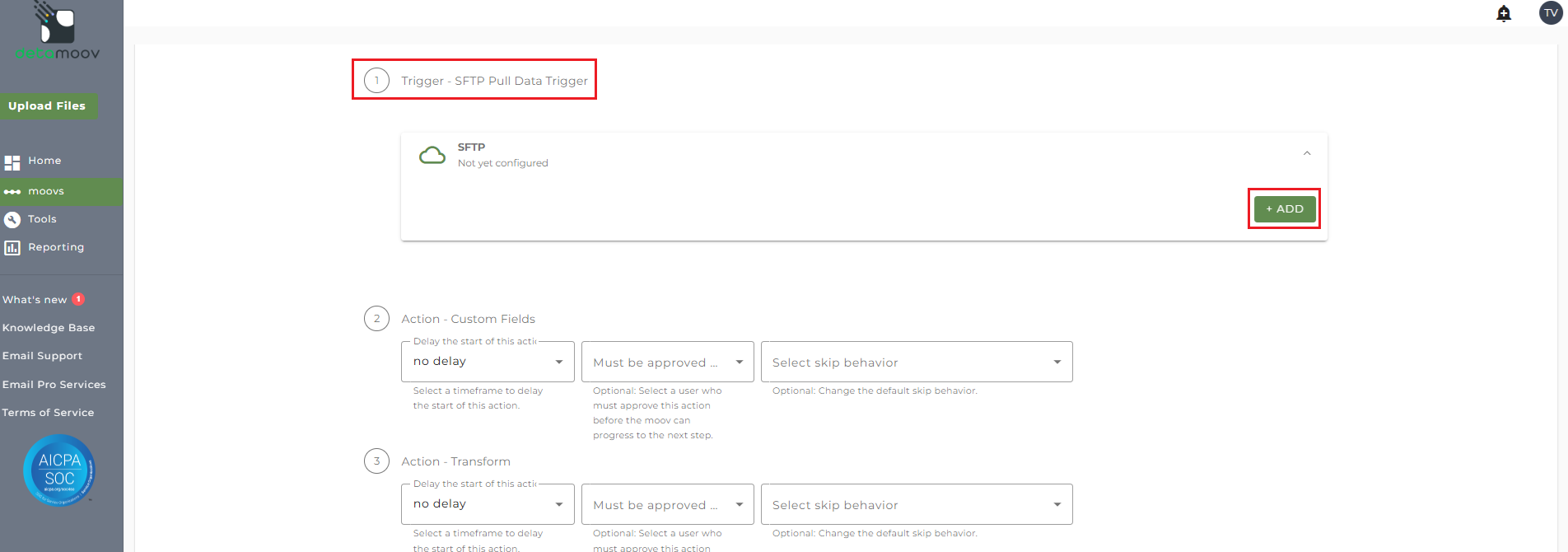 To automate the 360 integration, configure the SFTP schedule. Click the SFTP banner under the Trigger - SFTP Pull Data Trigger step and click Add.