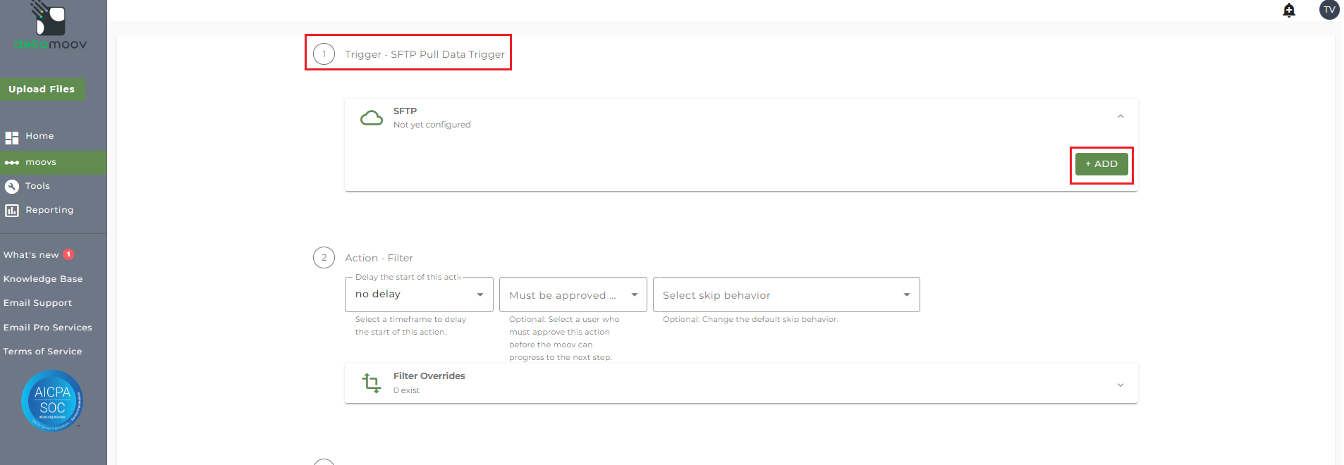 To automate the 360 integration, configure the SFTP schedule. Click the SFTP banner under the Trigger - SFTP Pull Data Trigger step and click Add.