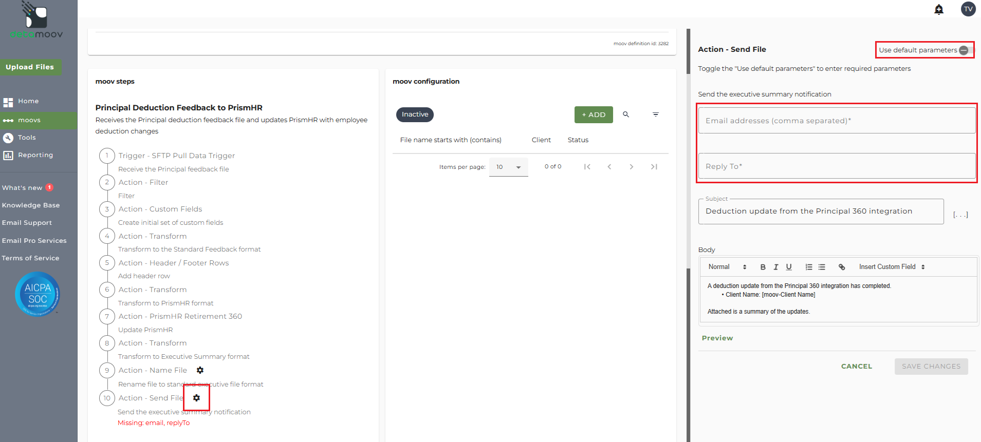 Note: these settings apply to any client configuration you set up for this specific moov. You also have the ability to configure the send file step for each client configuration if you wish to add or remove email addresses per client.