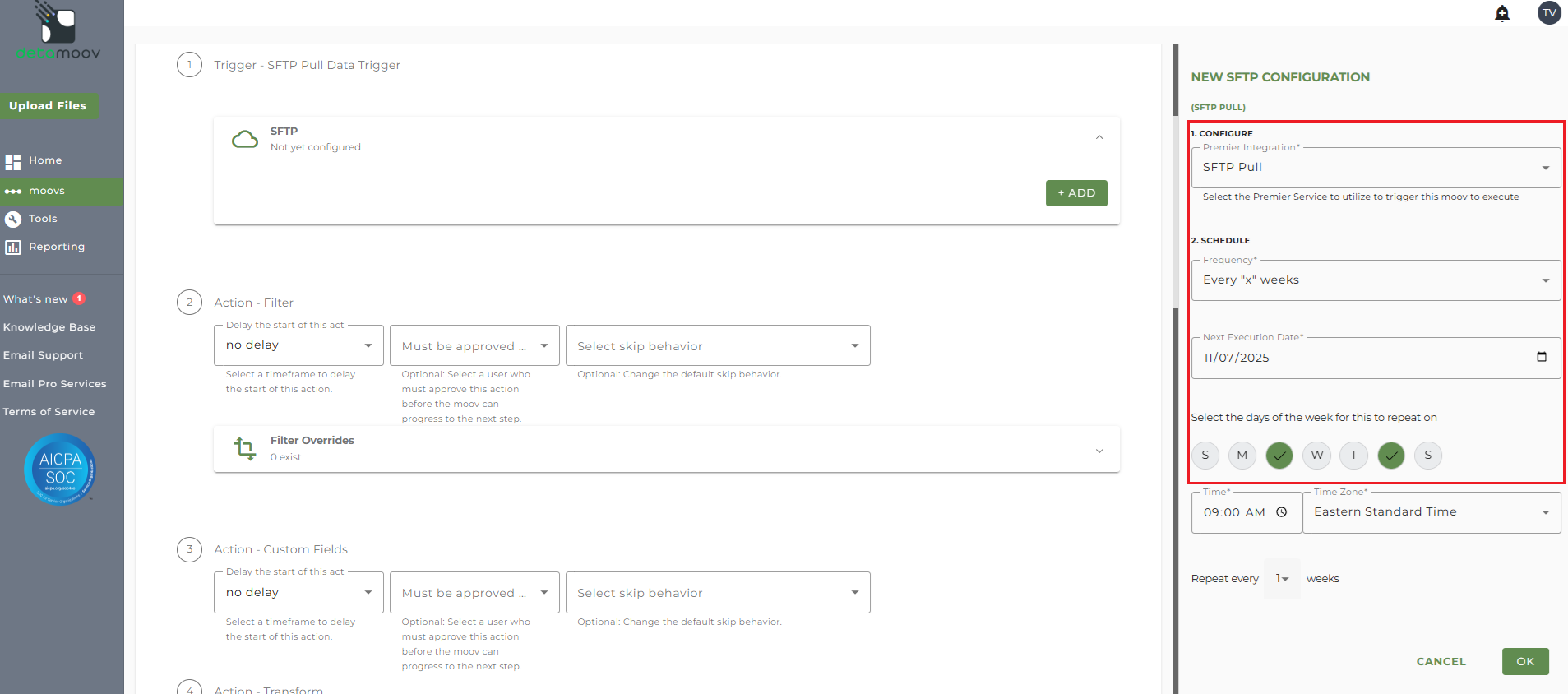 On the New SFTP Configuration section on the right, select the SFTP Pull option from the Premier Integration menu. Then select either "Every X weeks" or "On certain days of the month", depending on how often you would like detamoov to check for new feedback files. We recommend that you check for feedback files at least twice a week. In the example below, we have set up a schedule to check for files twice a week on Tuesdays and Fridays.