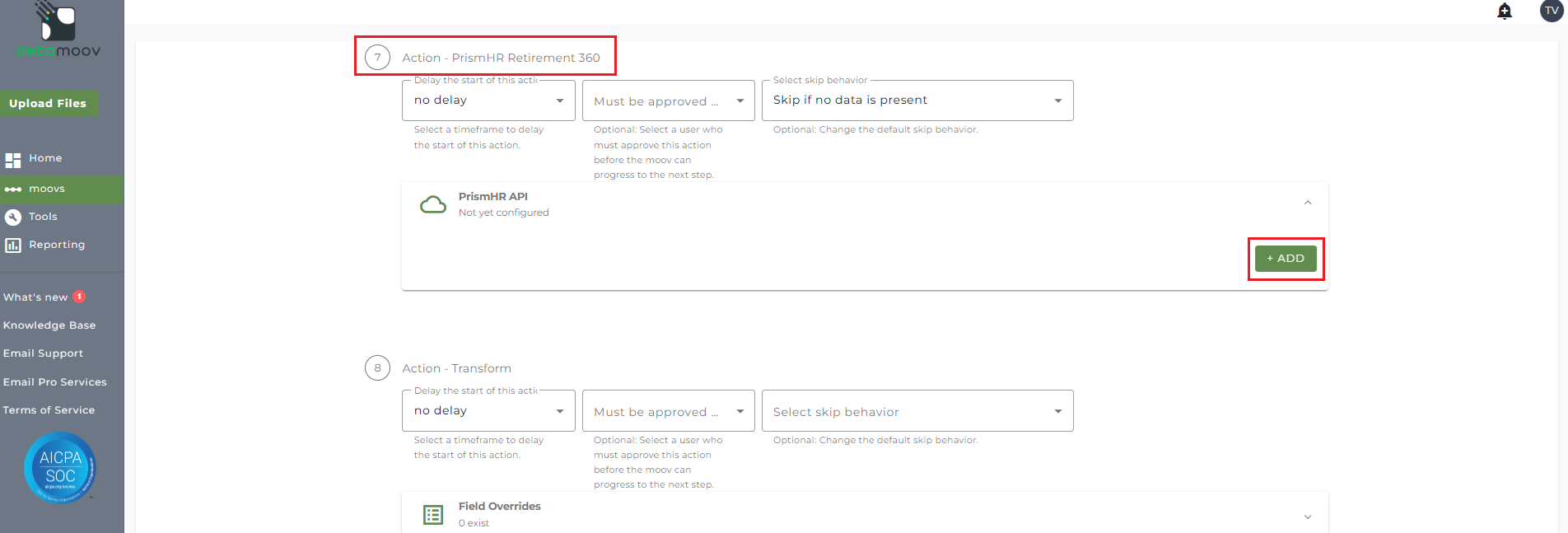 To configure the PrismHR Retirement 360 step for you client, locate the Action - PrismHR Retirement 360 step, expand the PrismHR API panel and click ADD.