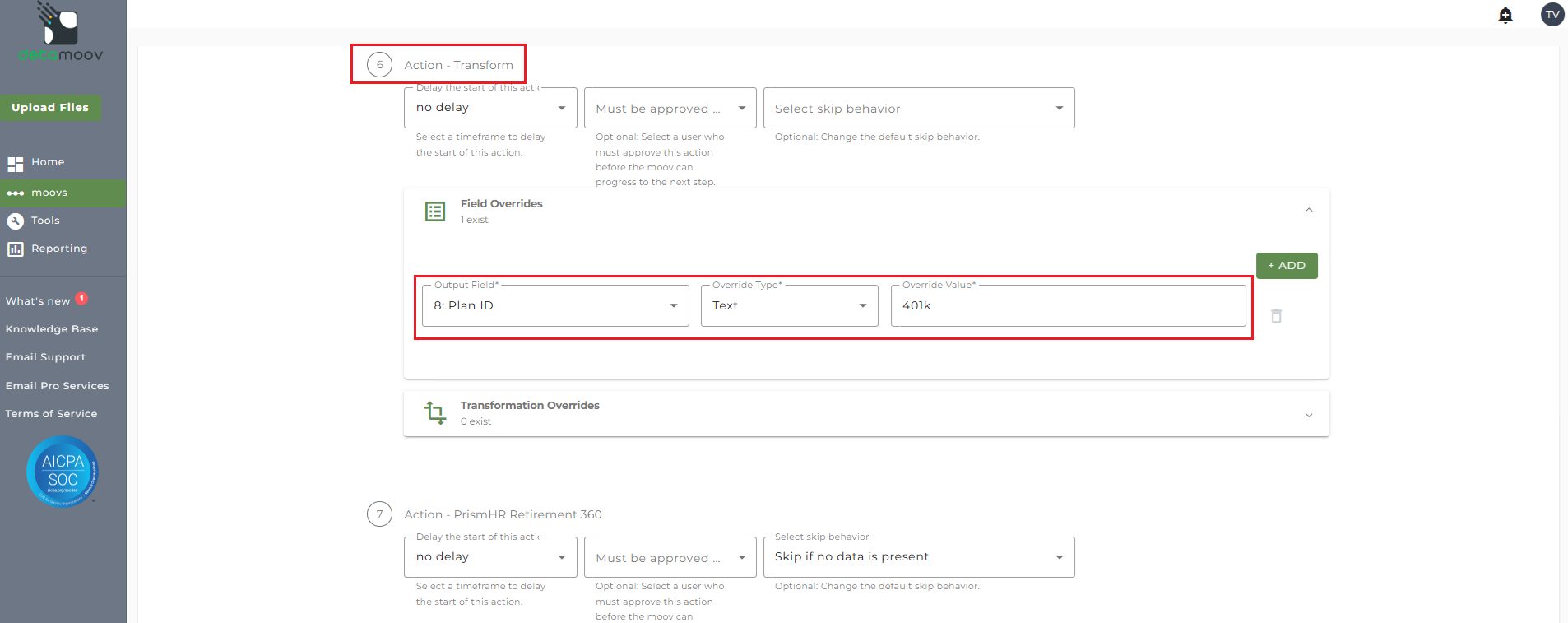 NOTE: There are 3 separate Transform steps on the Principal Deduction Feedback to PrismHR moov. Make sure are you creating the field override on step 6: Action Transform.