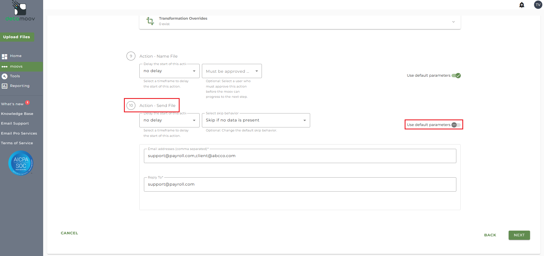 Note: these settings apply to any client configuration you set up for this specific moov. You also have the ability to configure the send file step for each client configuration if you wish to add or remove email addresses per client.