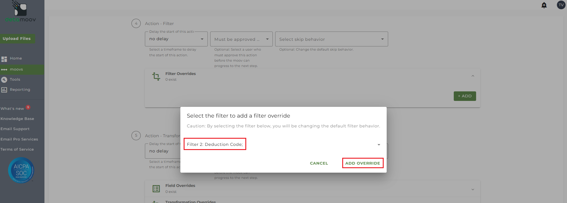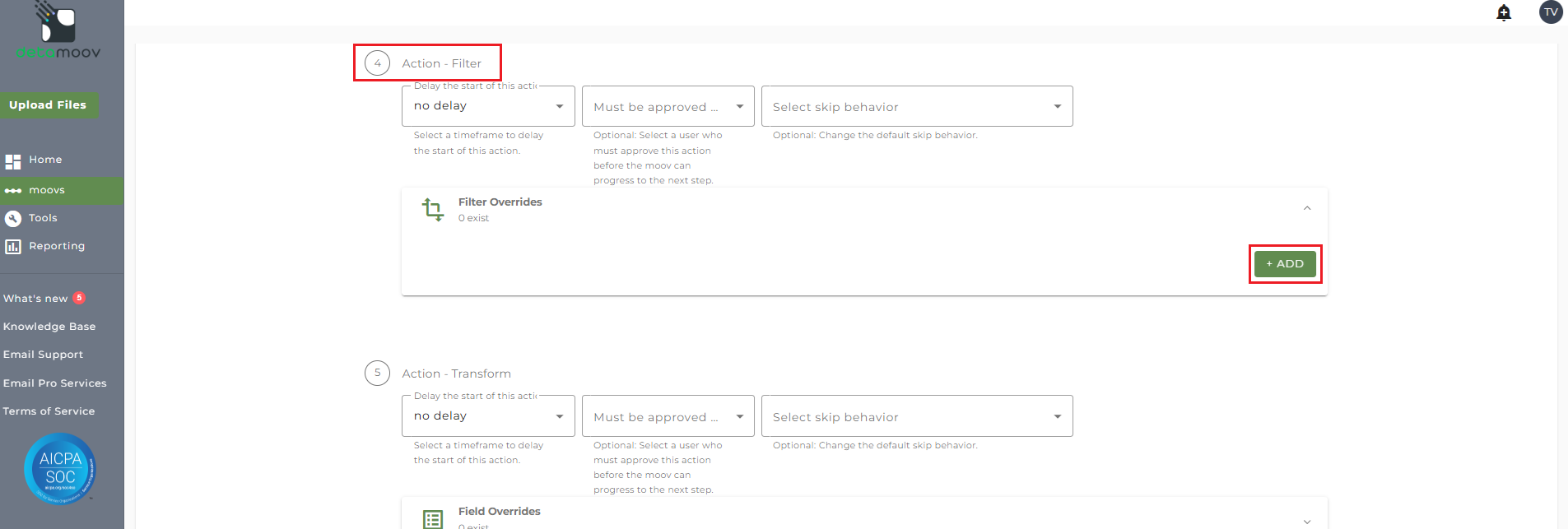 To create a filter override locate the Action - Filter step, expand the Filter Overrides section and click ADD.