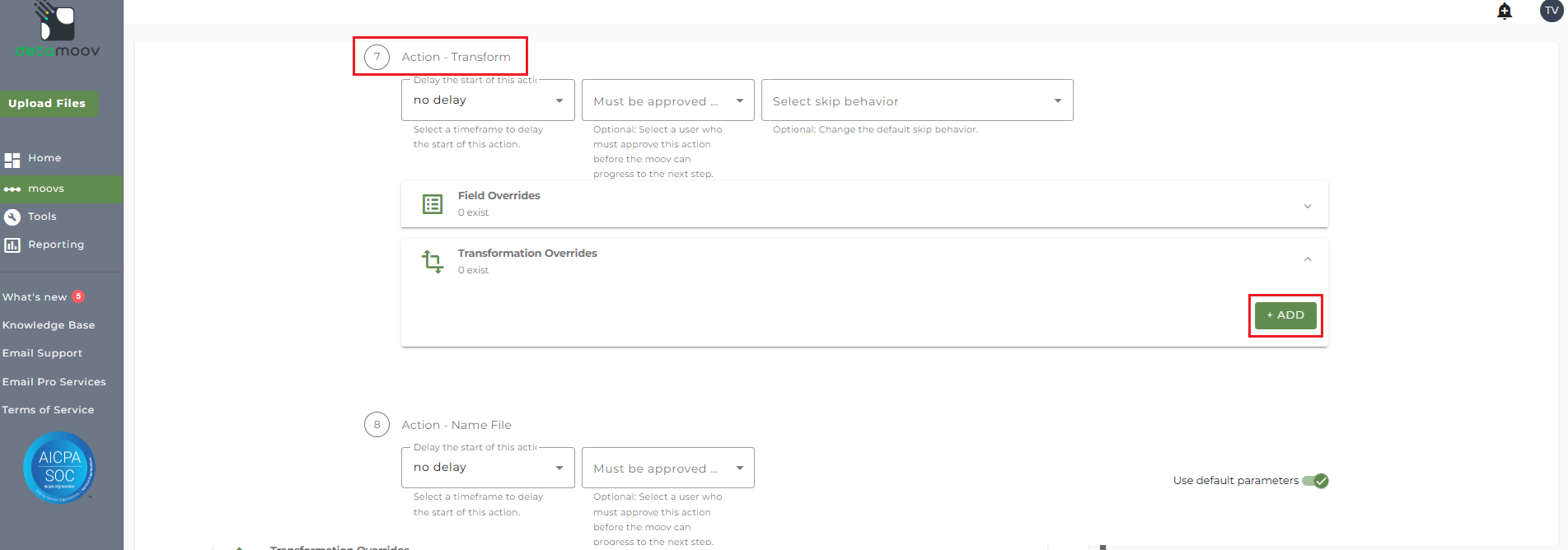 To provide a transformation override, locate step 7 - Action Transform, expand the Transformation Overrides panel and click ADD.