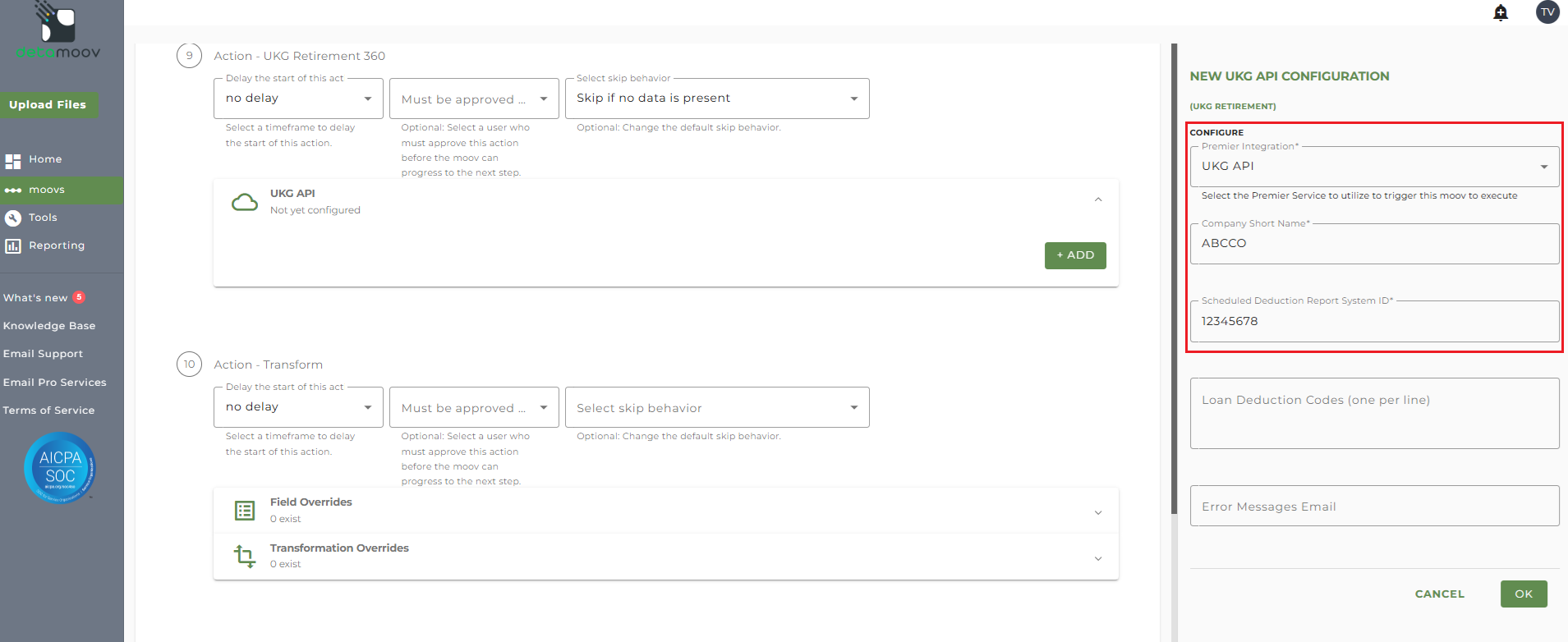 detamoov uses a Scheduled Deductions saved report that is called through the UKG API. Each company will need to have this report created before the 360 integration can be configured. See the Create the Scheduled Deduction Report for 360 Retirement Integrations article for steps on how to create this report.