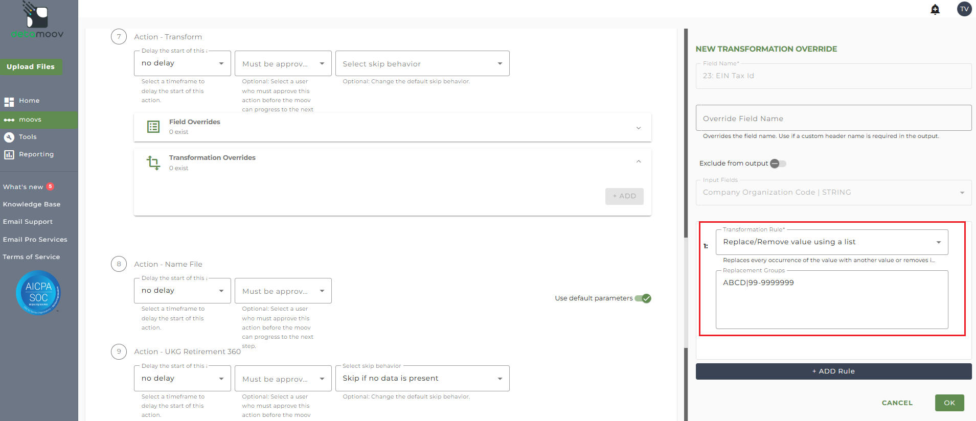 Then click the Add Rule button and select the 'Replace/Remove exact value using a list' rule. In the Replacement Groups field, create a group for each of the expected Division Names and the EIN Name or Tax Id you want to replace it with. For example, if we expect the Division Name 'ABCD' and wish to map it to the EIN Tax Id 99-9999999, we would create a Replacement Group as ABCD|99-9999999.