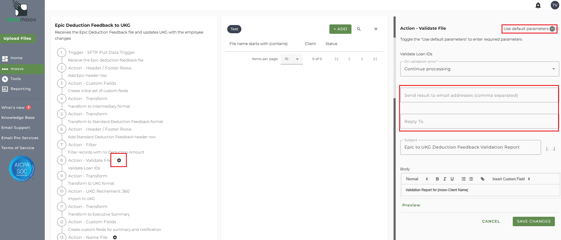To edit the validate file step, click on the cog icon under the Action - Validate Files step on the left. Then toggle the "Use default parameters" off and enter in the email addresses you would like to receive the notification. If you would like to enter multiple email addresses, separate them with a comma. A Reply to email is also required in the event that a recipient of the notification replies to the email.