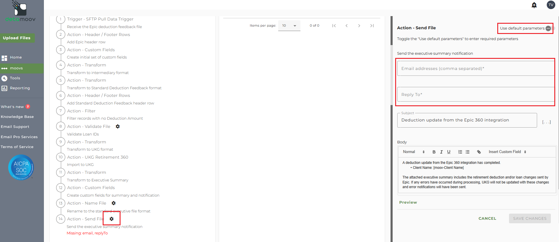 At the beginning of this article you configured the send file step for the moov to send a notification once the moov had completed. You also have the ability to configure the send file step for each client configuration if you wish to add or remove email addresses per client.