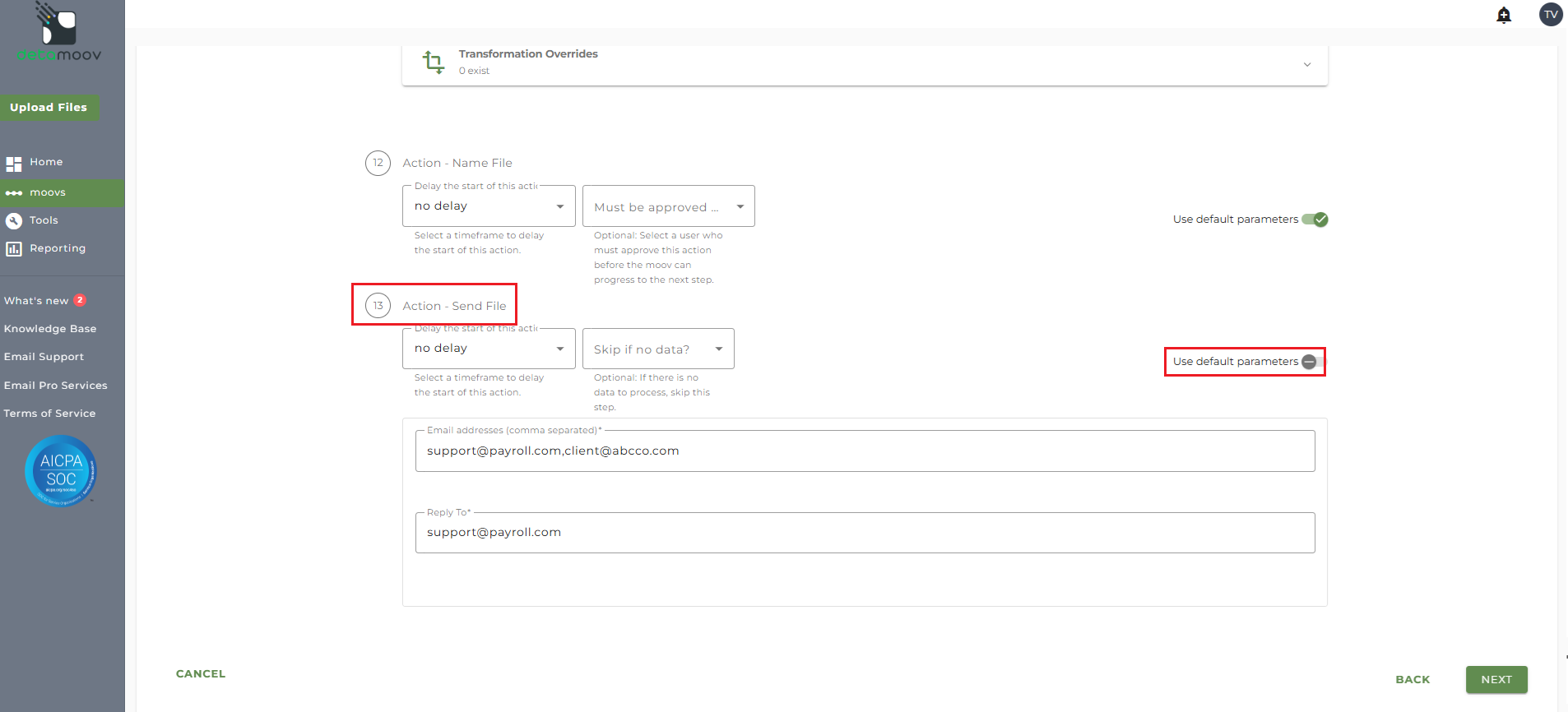 Note: these settings apply to any client configuration you set up for this specific moov. You also have the ability to configure the send file step for each client configuration if you wish to add or remove email addresses per client.