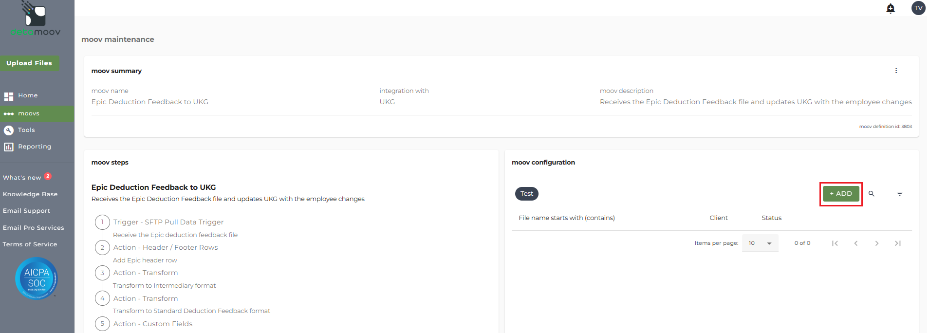 Once the Epic Deduction Feedback to UKG moov has been added to your account, access the moovs section on the left side menu and click on the Epic Deduction Feedback to UKG moov.