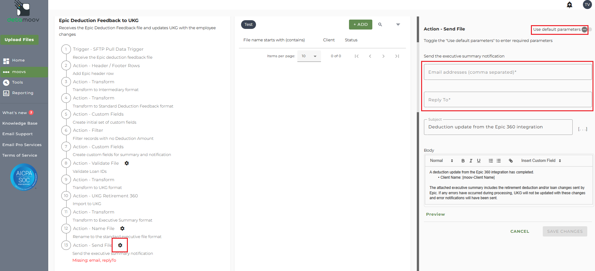 At the beginning of this article you configured the send file step for the moov to send a notification once the moov had completed. You also have the ability to configure the send file step for each client configuration if you wish to add or remove email addresses per client.