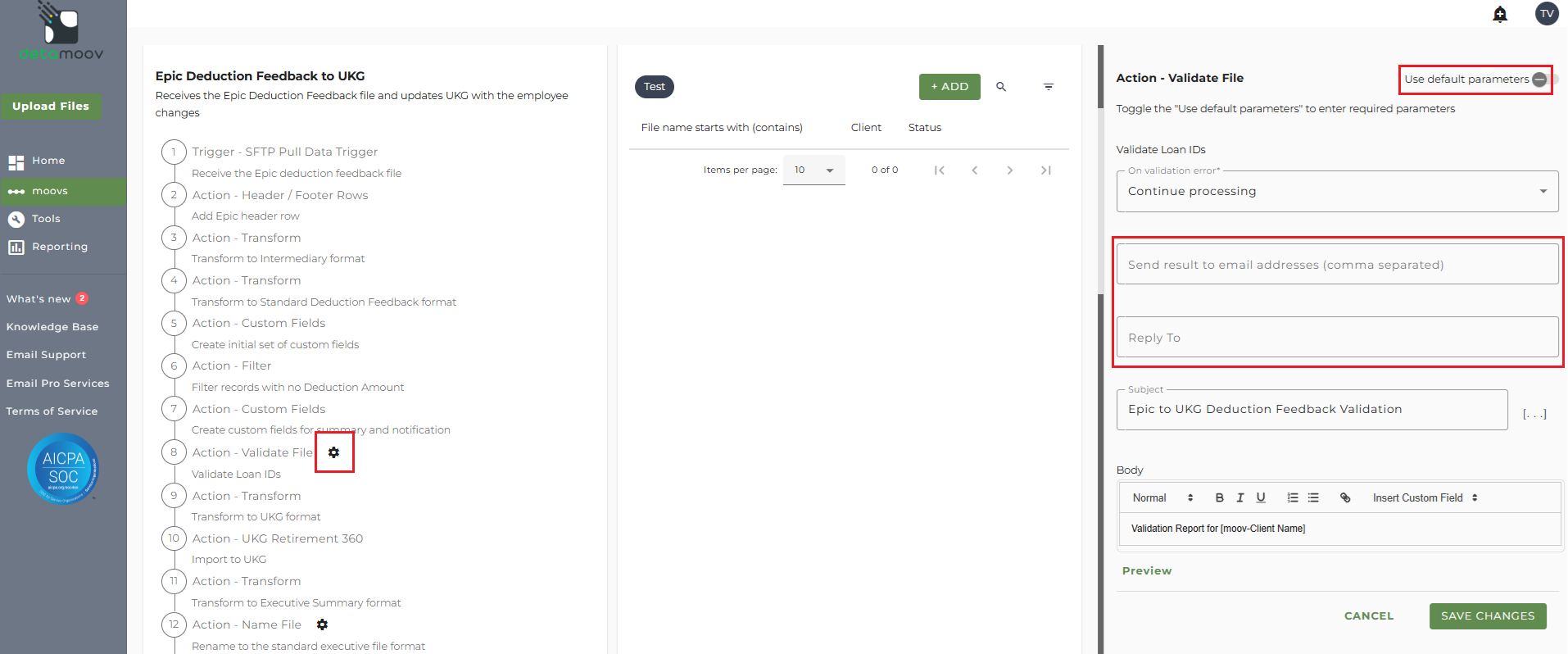To edit the validate file step, click on the cog icon under the Action - Validate Files step on the left. Then toggle the "Use default parameters" off and enter in the email addresses you would like to receive the notification. If you would like to enter multiple email addresses, separate them with a comma. A Reply to email is also required in the event that a recipient of the notification replies to the email.