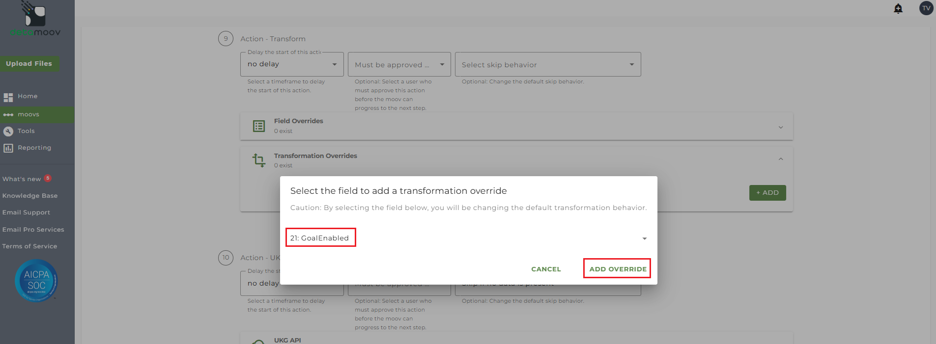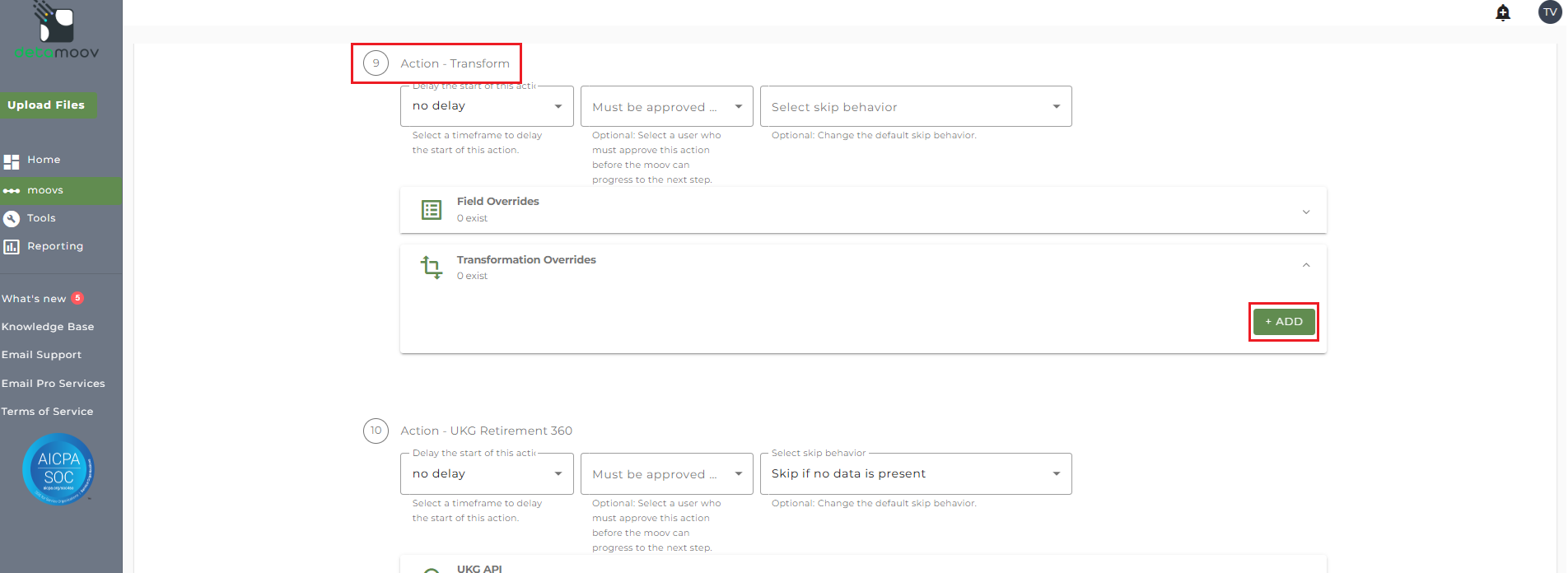 To provide a transformation override, locate step 9 - Action Transform, expand the Transformation Overrides panel and click ADD.
