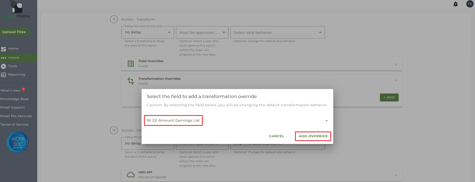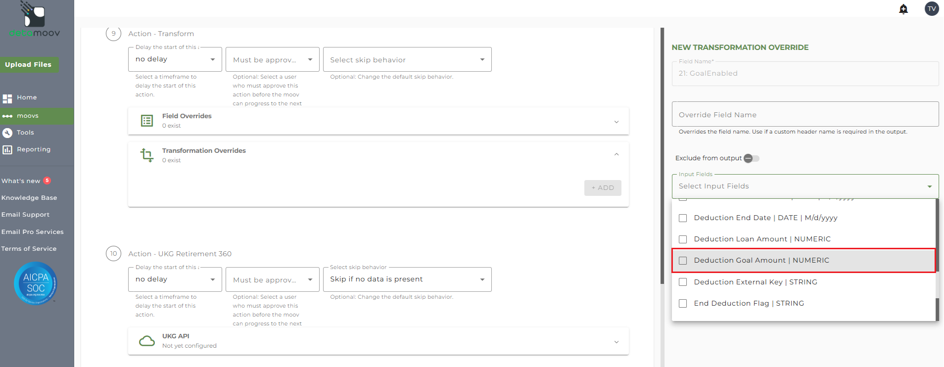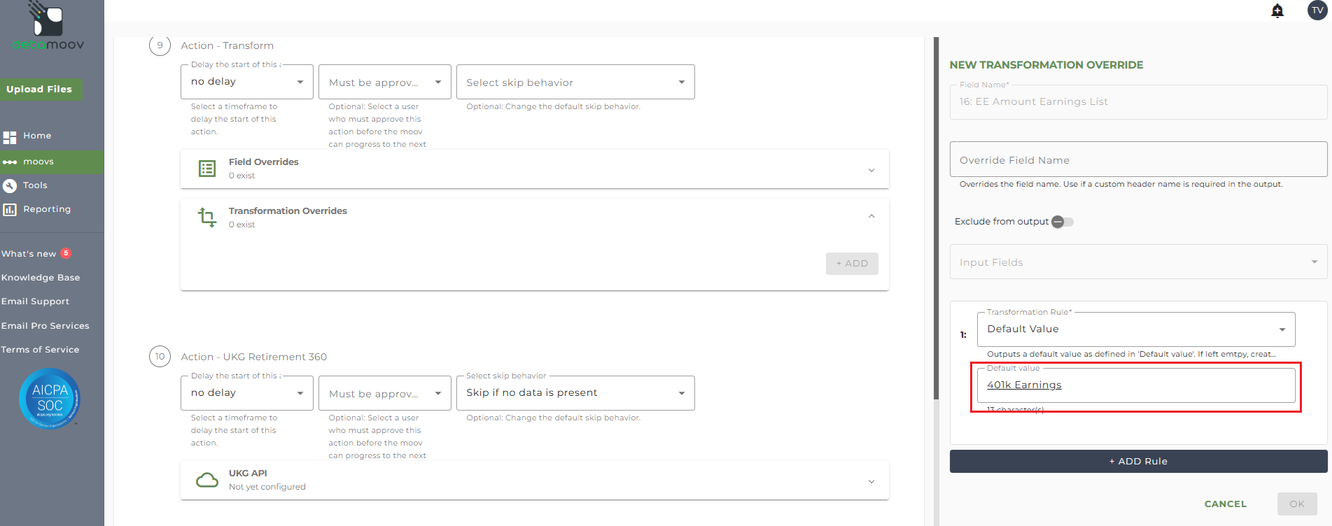 Example: detamoov receives the Epic deduction feedback file with 401k Percent Amount and converts it to 401k. A transformation is then performed to convert 401k to the UKG code. By default, this value would be 401k. If your client's deduction code is different in UKG, say your UKG deduction code is PreTax instead of 401k, then you will need to provide a transformation override for the Deduction Code field.