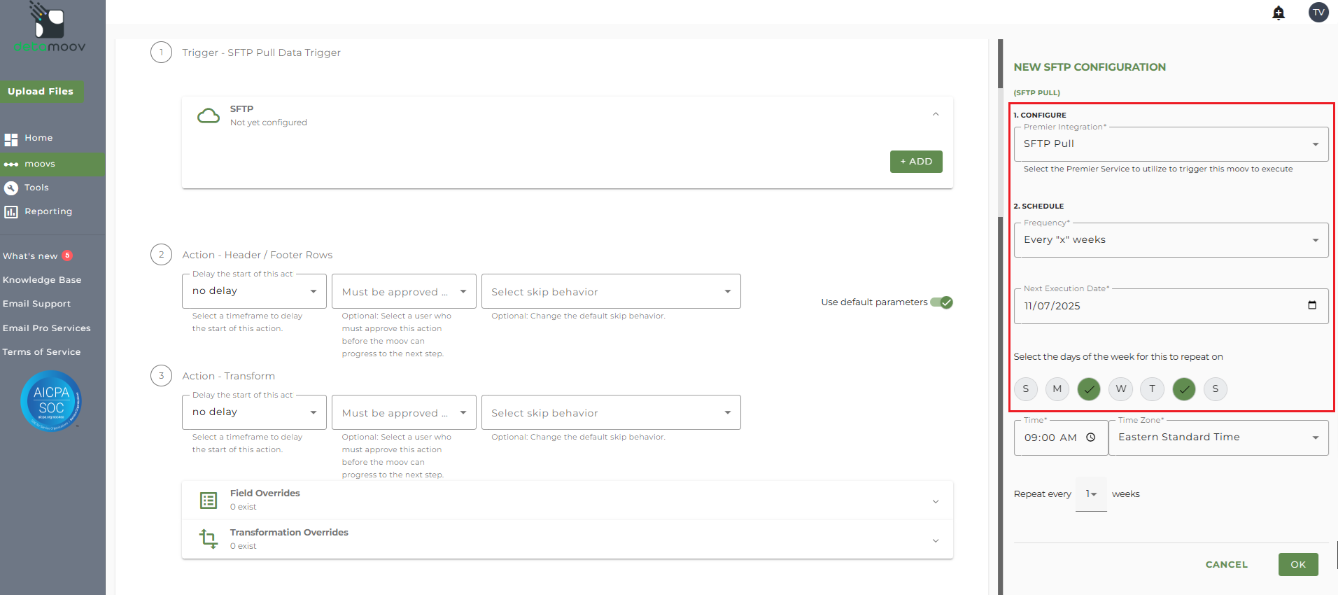 On the New SFTP Configuration section on the right, select the SFTP Pull option from the Premier Integration menu. Then select either "Every X weeks" or "On certain days of the month", depending on how often you would like detamoov to check for new deduction files. We recommend that you check for feedback files at least twice a week. In the example below, we have set up a schedule to check for files twice a week on Tuesdays and Fridays.