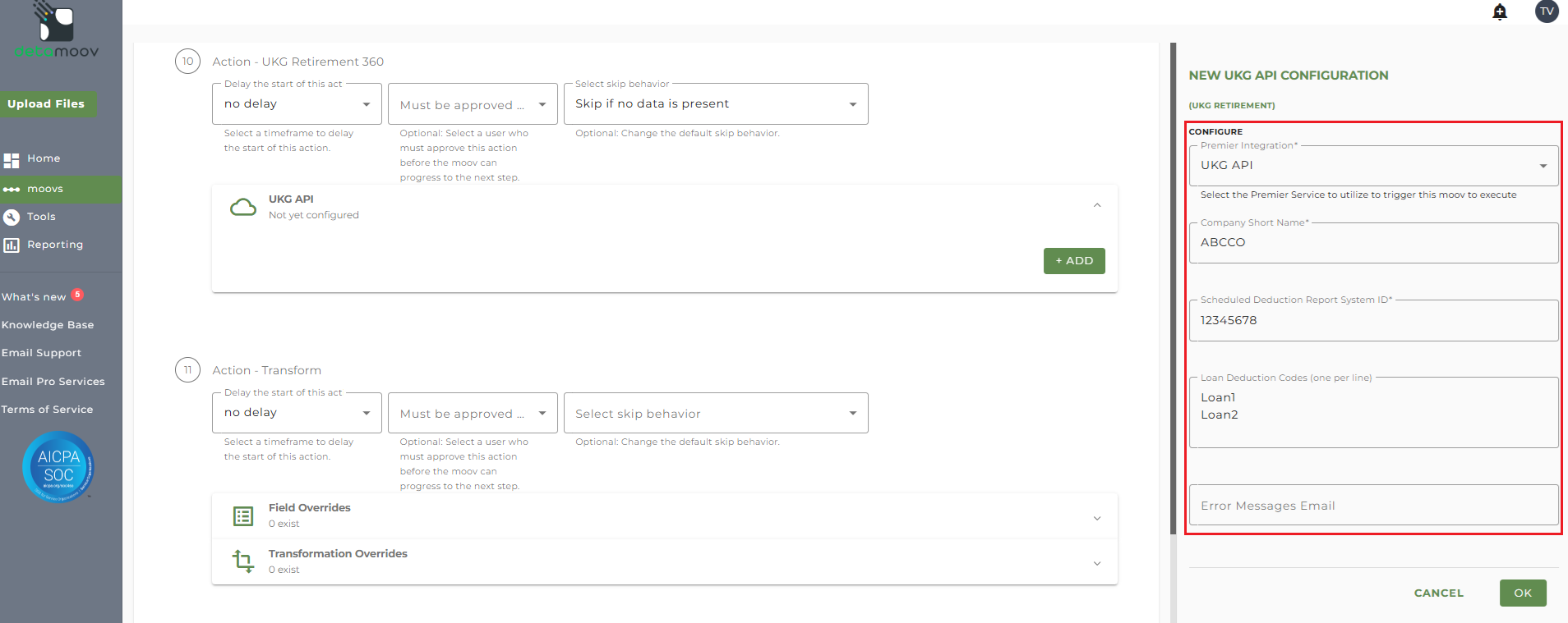You can also enter in one or more email addresses in the Error Messages Email. If left blank, all detamoov users on your account will receive emails if the UKG API import fails.