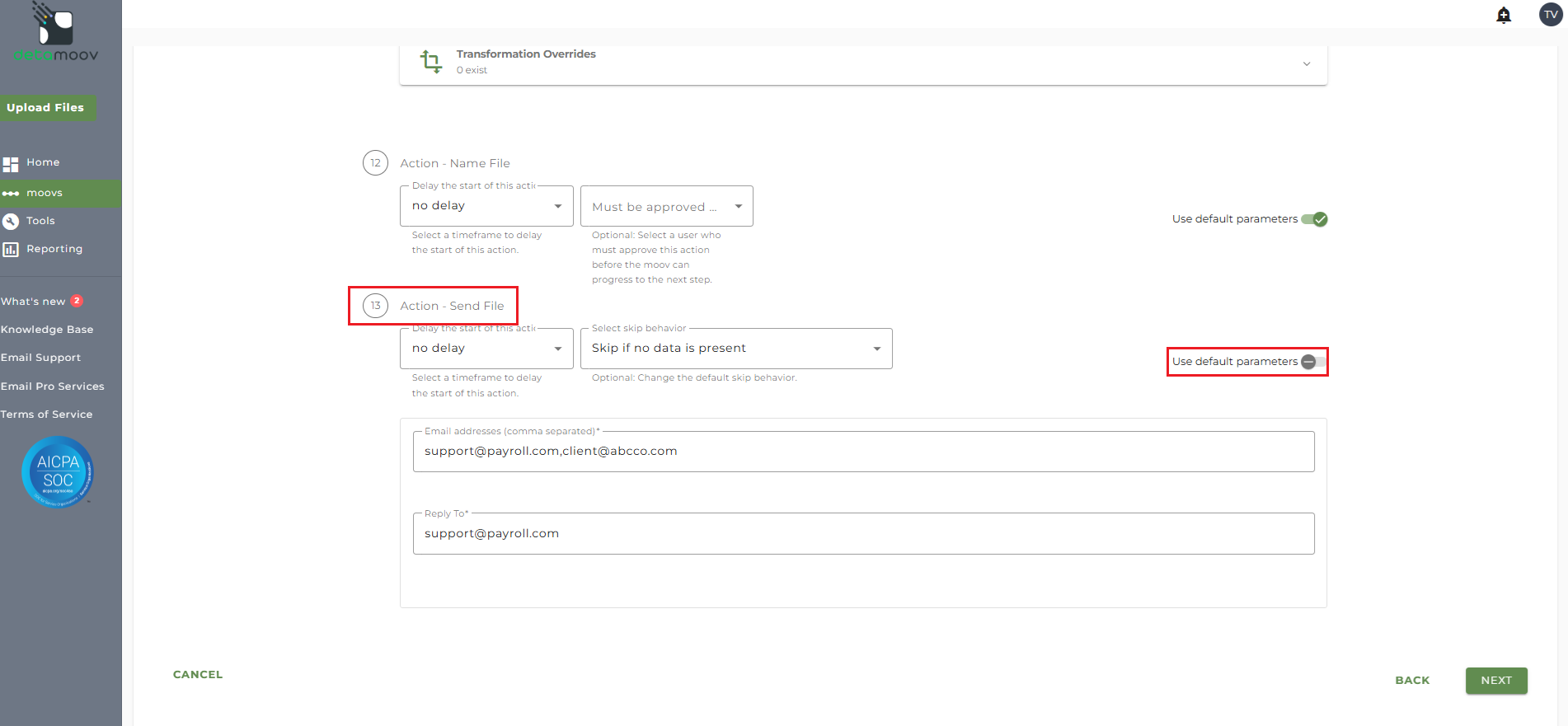 Note: these settings apply to any client configuration you set up for this specific moov. You also have the ability to configure the send file step for each client configuration if you wish to add or remove email addresses per client.
