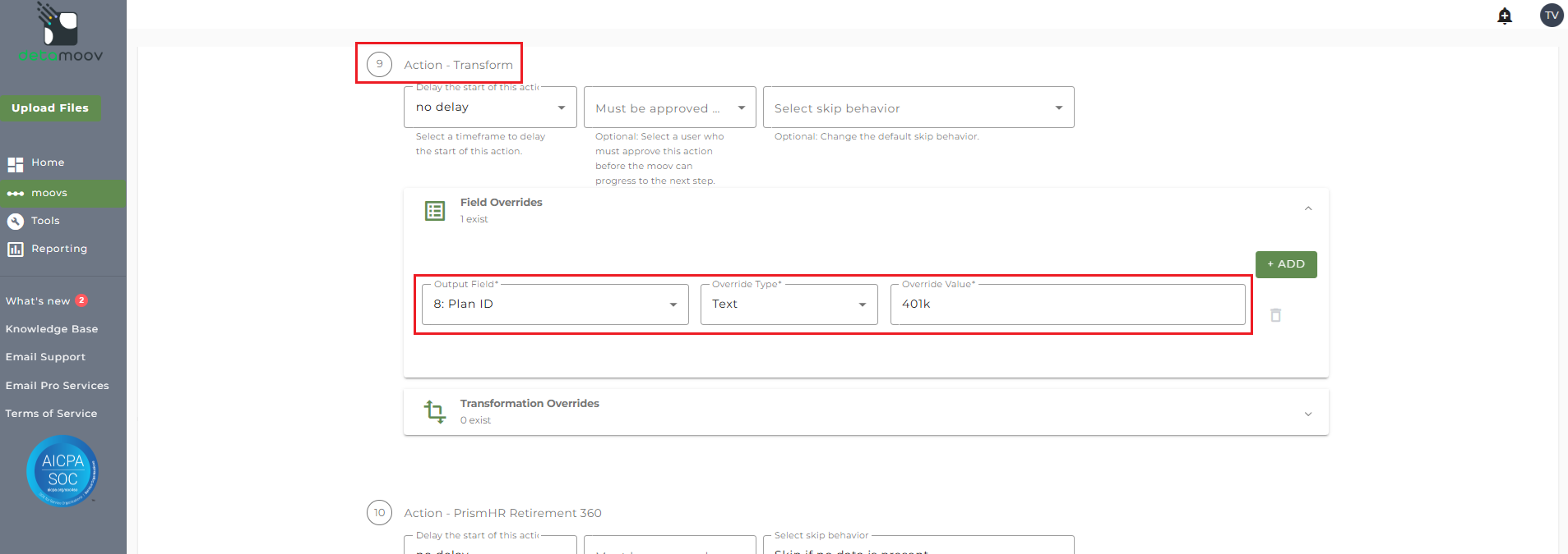 NOTE: There are 4 separate Transform steps on the Epic Deduction Feedback to PrismHR moov. Make sure are you creating the field override on step 9: Action - Transform.