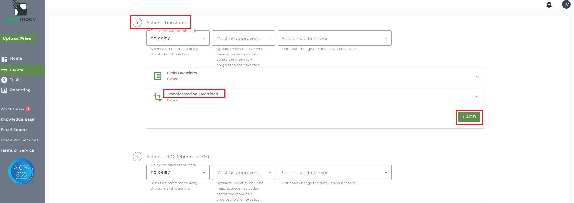 To provide a transformation override, locate step 5- Action Transform, expand the Transformation Overrides panel and click ADD.