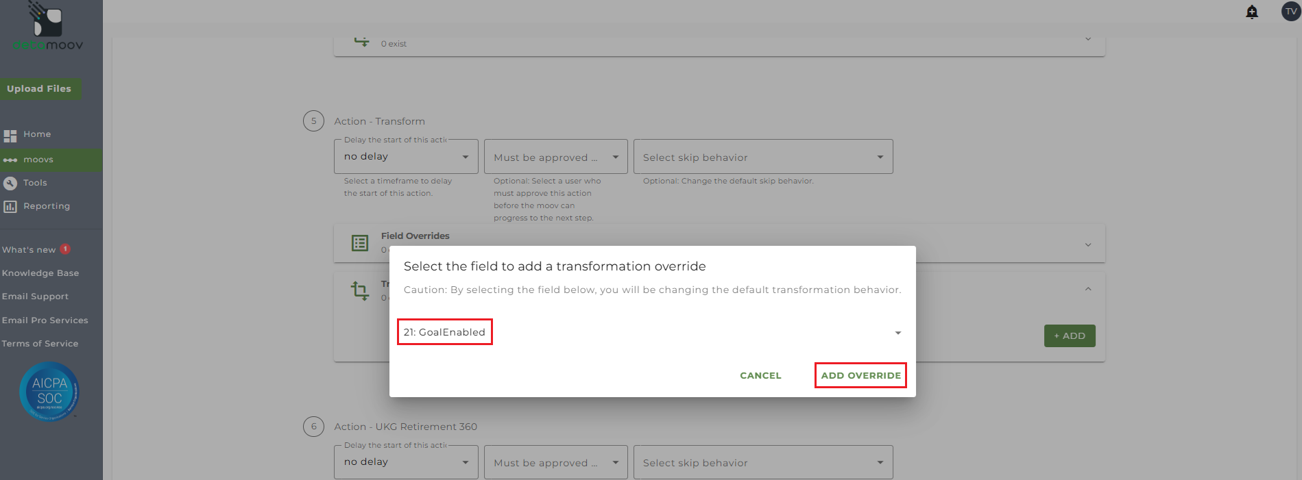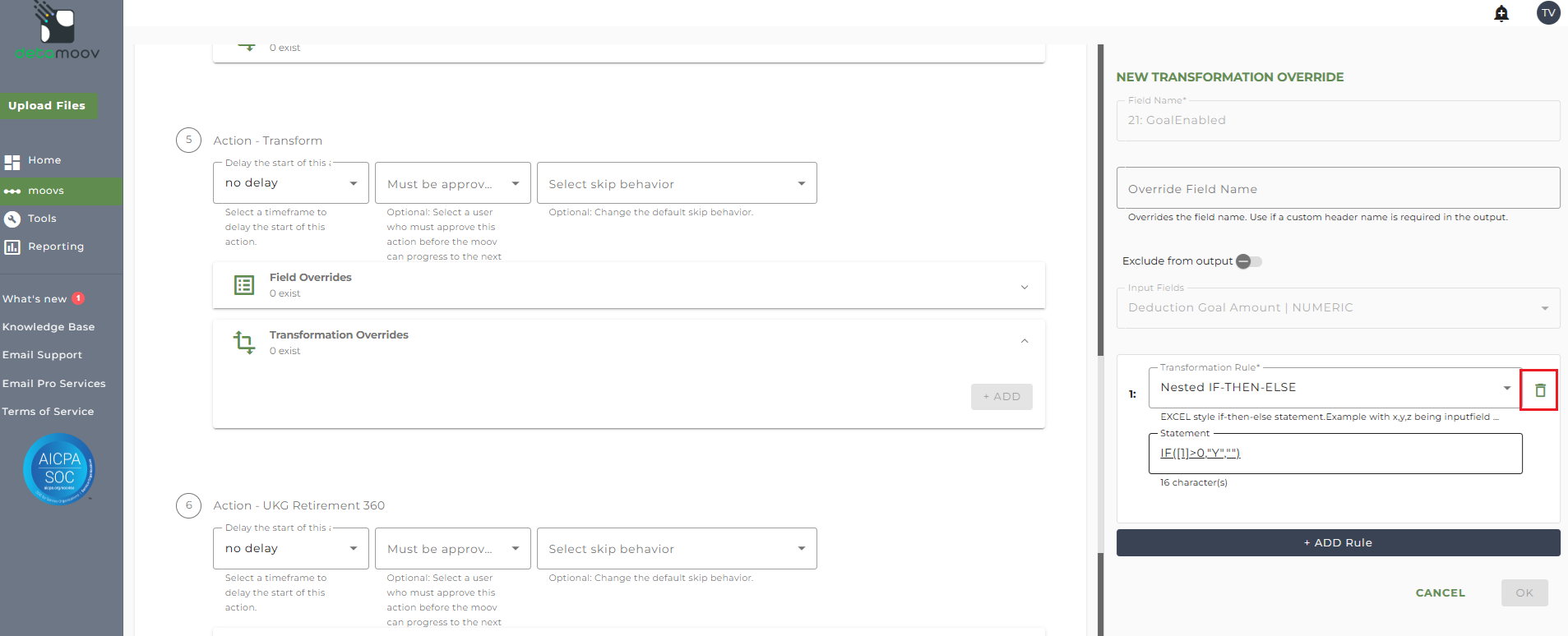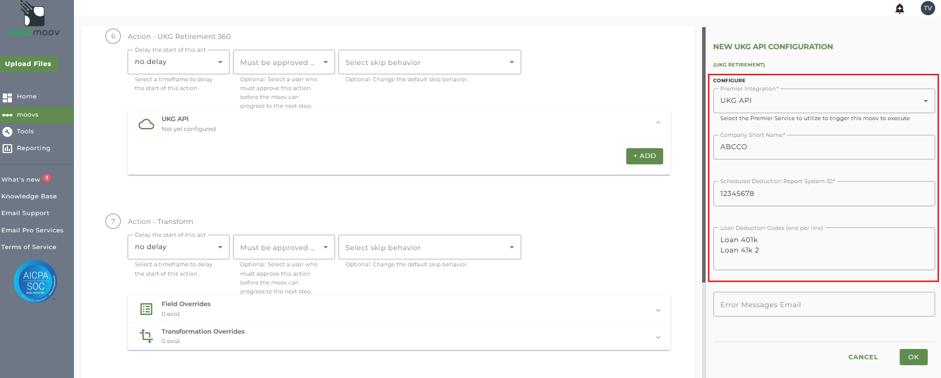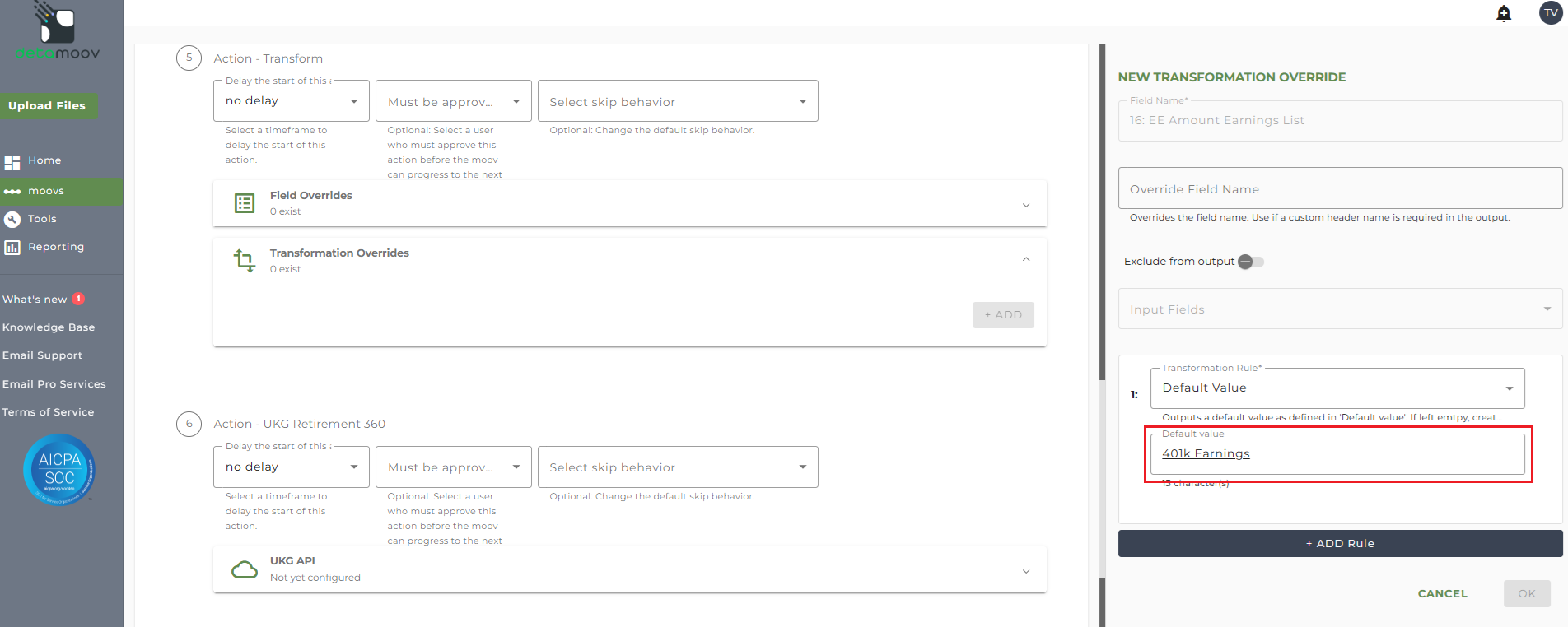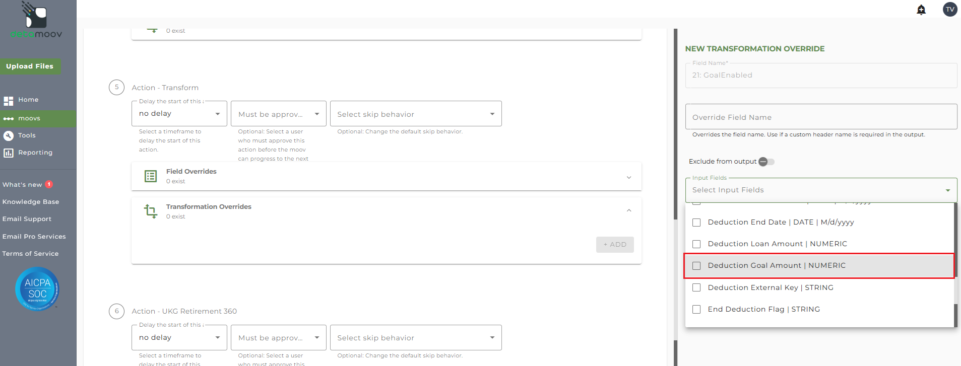 Note: The Alerus Deduction Feedback to UKG moov contains 3 separate Transform steps. The following information relates to step 5 Action - Transform only.
