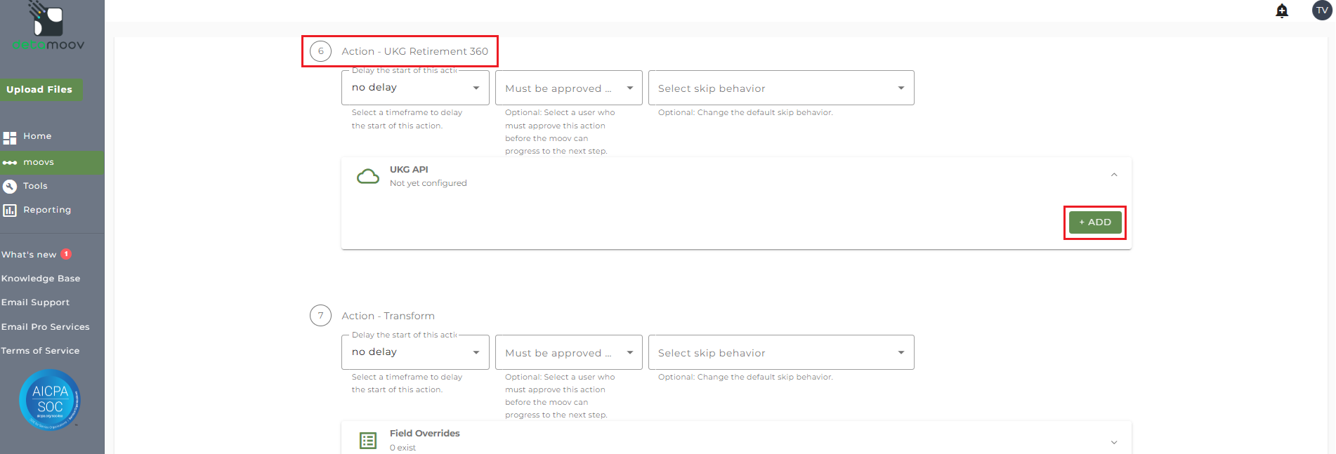 To configure the UKG Retirement 360 step for you client, locate the Action - UKG Retirement 360 step, expand the UKG API panel and click ADD.