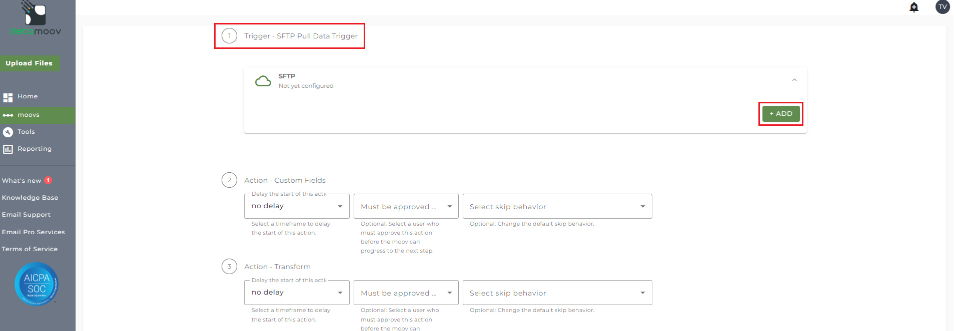 To automate the 360 integration, configure the SFTP schedule. Click the SFTP banner under the Trigger - SFTP Pull Data Trigger step and click Add.