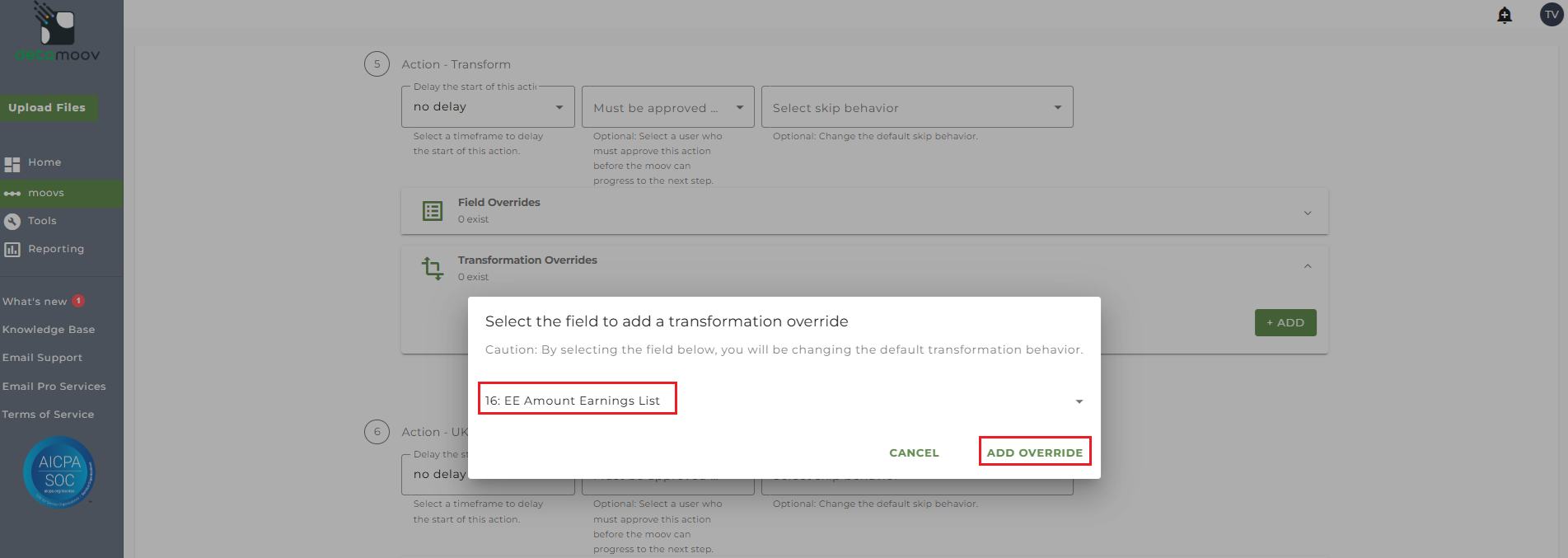 To provide a transformation override, locate step 5 - Action Transform, expand the Transformation Overrides panel and click ADD.