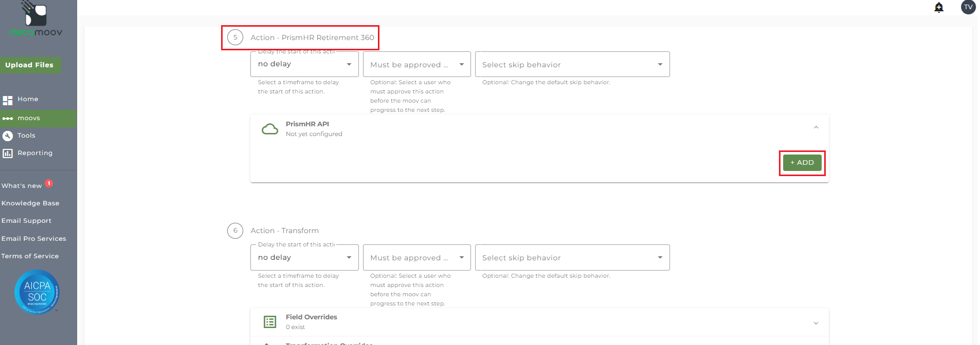 To configure the PrismHR Retirement 360 step for you client, locate the Action - PrismHR Retirement 360 step, expand the PrismHR API panel and click ADD.