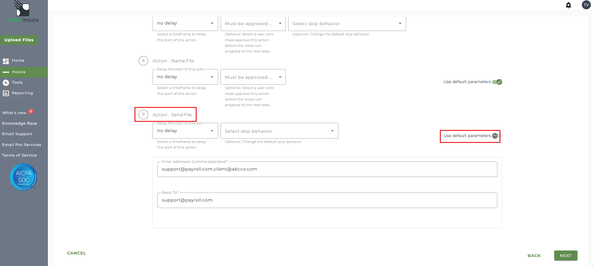 Note: these settings apply to any client configuration you set up for this specific moov. You also have the ability to configure the send file step for each client configuration if you wish to add or remove email addresses per client.